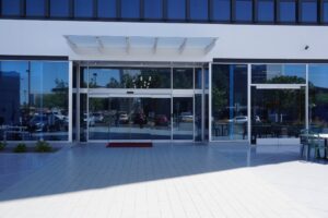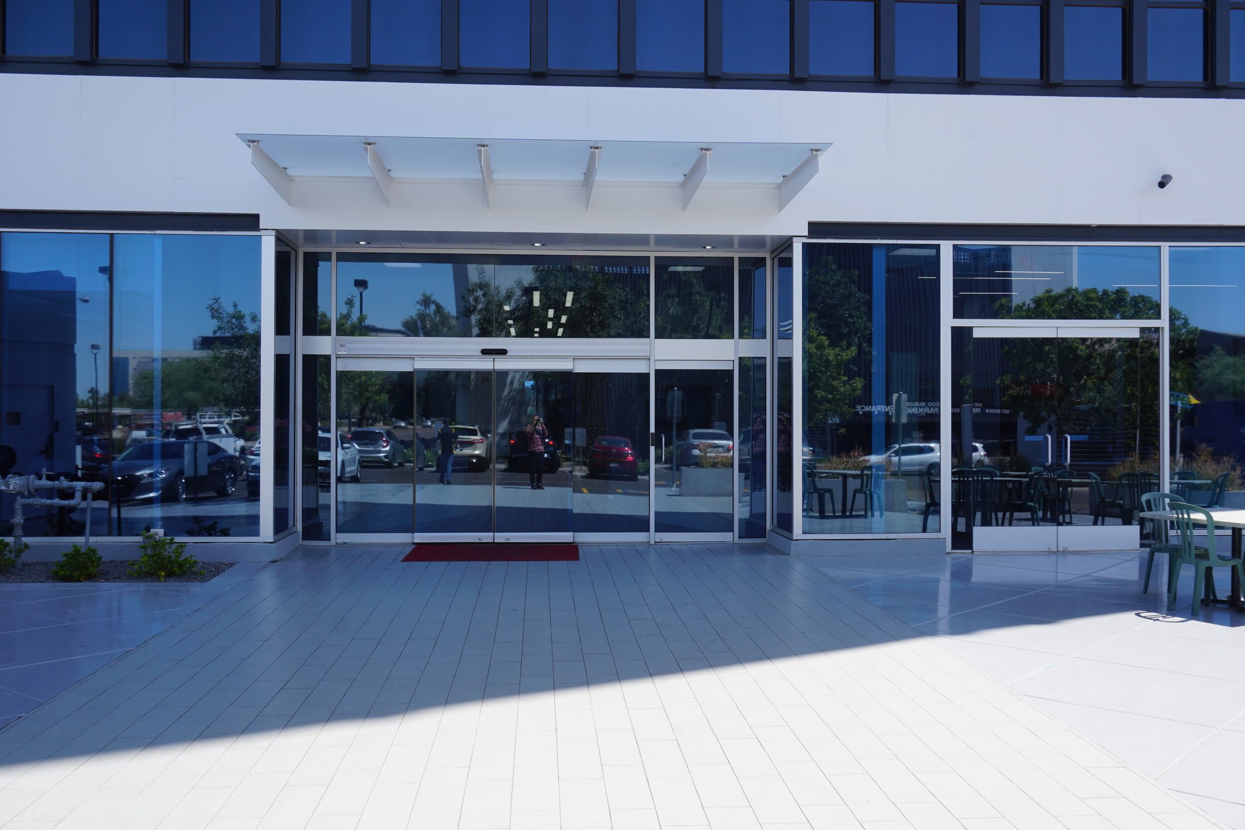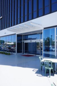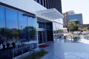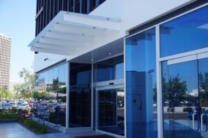 A decorative architectural awning providing shade and visual appeal at the main entrance of Bank of America in Downtown Phoenix, Arizona. Crafted with tempered glass supported by steel beams, this custom structure combines durability and modern design to enhance the building’s entrance during the bank’s renovation.