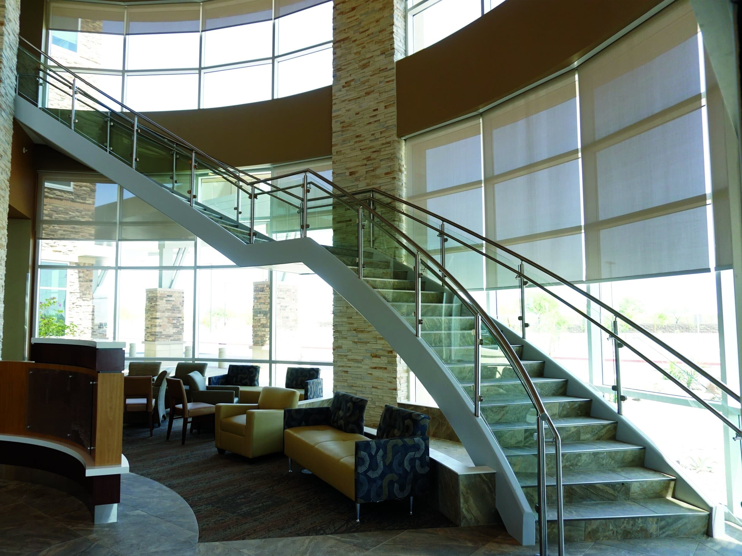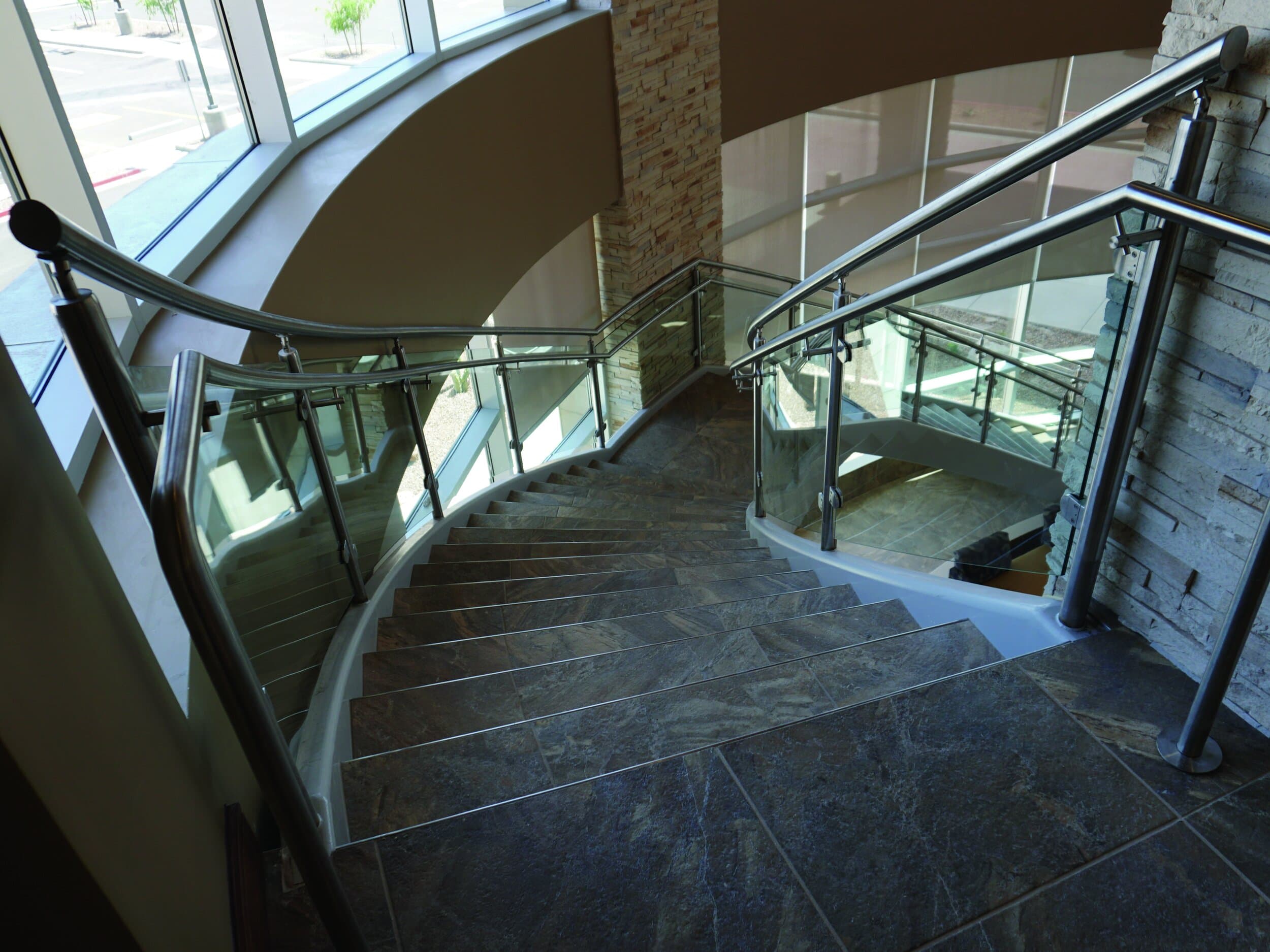 We fabricated and installed a glass guardrail and stainless steel handrail for the curved staircase at Adeptus General Hospital in Mesa, Arizona. The system was designed to provide safety and code compliance while maintaining openness and visibility, with the glass panels and stainless steel accents complementing the staircase’s smooth curves and the hospital’s modern interior environment.