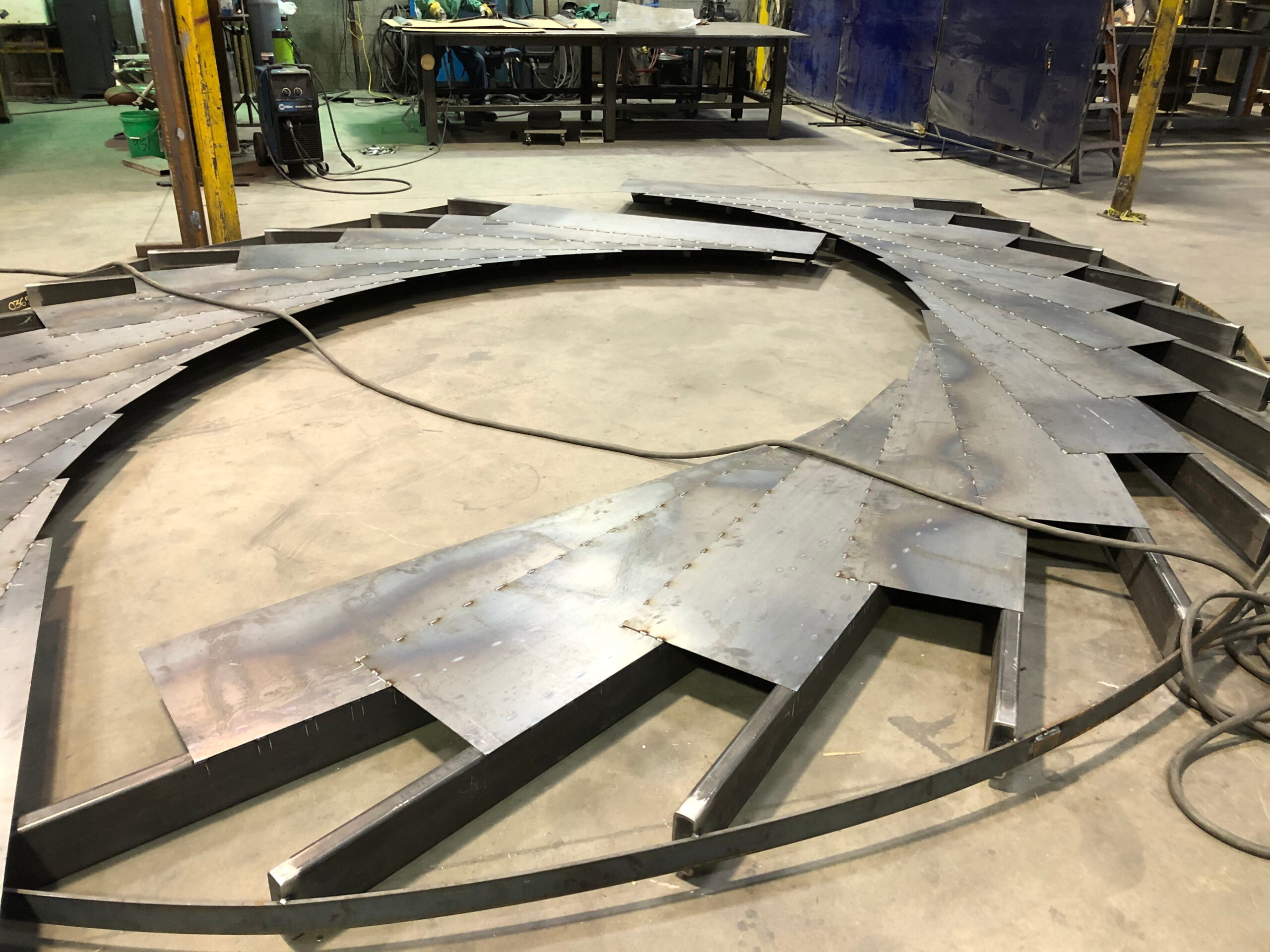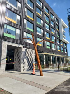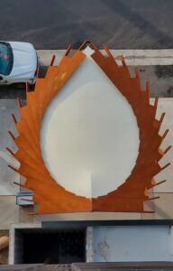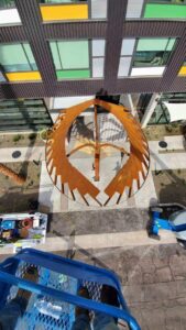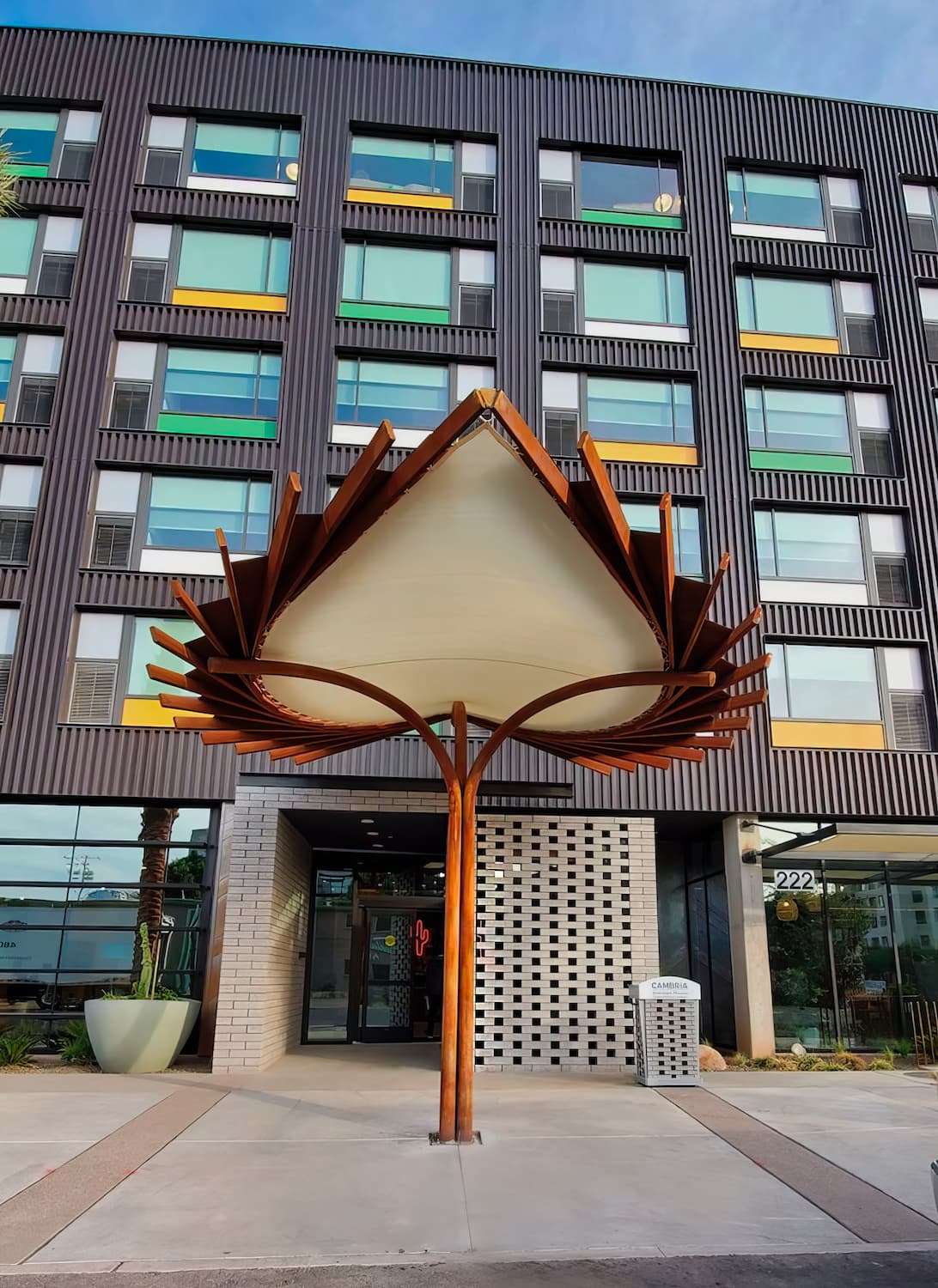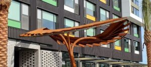 A striking, custom spade-shaped canopy marks the front entrance of the Cambria Hotel. Crafted from CorTen rectangular tubing, sheet, and round tube, the design uses clean, straight lines to form elegant arches, combining strength with visual interest. Magnum Companies handled the entire process, from precision fabrication to professional installation, ensuring the piece enhances both form and function.