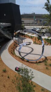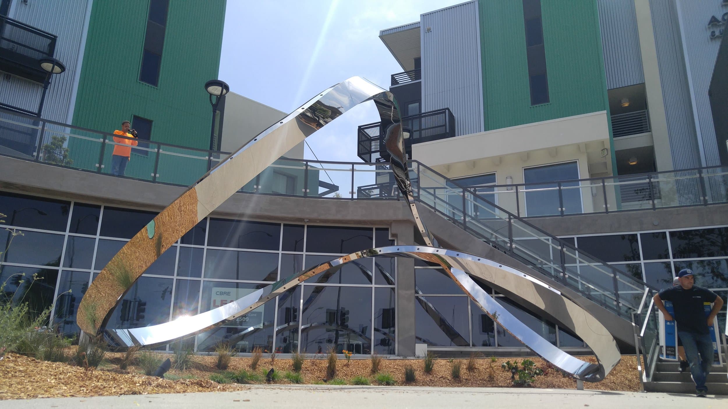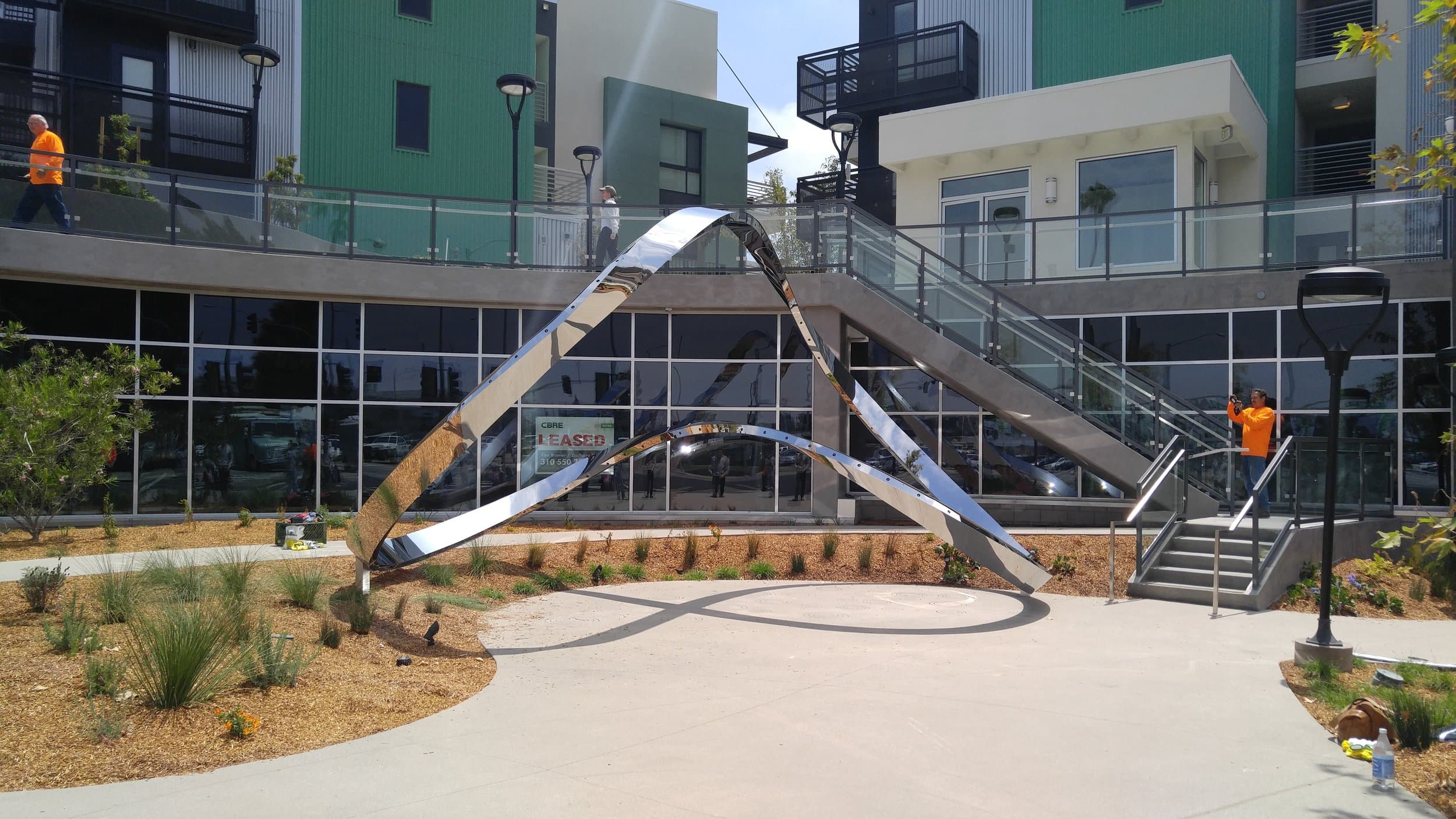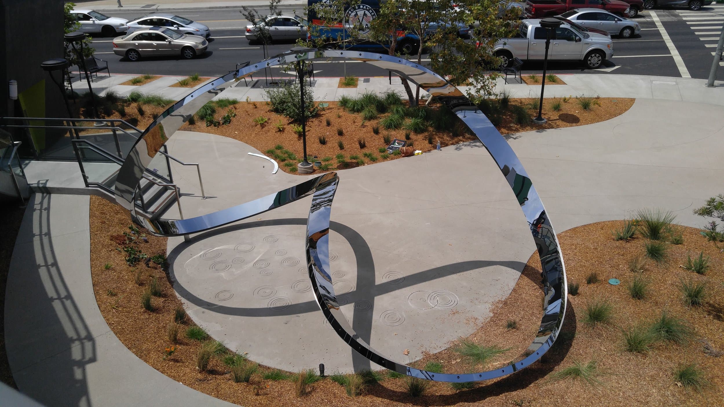 Shaped as a mirror-polished stainless steel band that seamlessly twists into a Möbius-like form, this sculpture recalls the elegance of a falling raindrop while suggesting continuity and motion. The highly reflective surface responds to its surroundings, changing with light, weather, and the movement of visitors. An integrated fog system adds a sensory layer, providing cooling and a subtle sense of animation within the space. The artwork was fabricated off-site and transported by truck across the country before being installed in a park in Downtown Culver City, California.