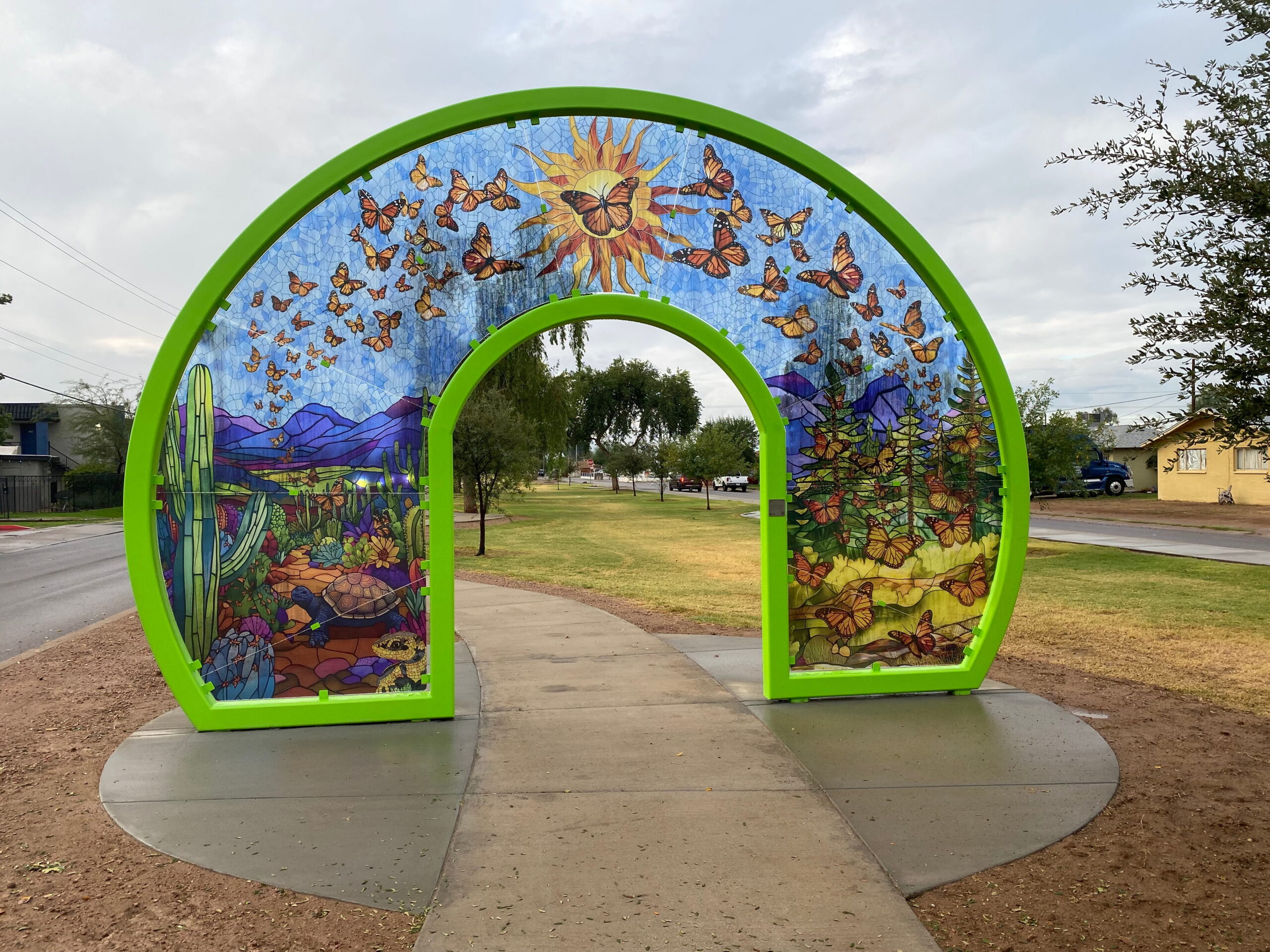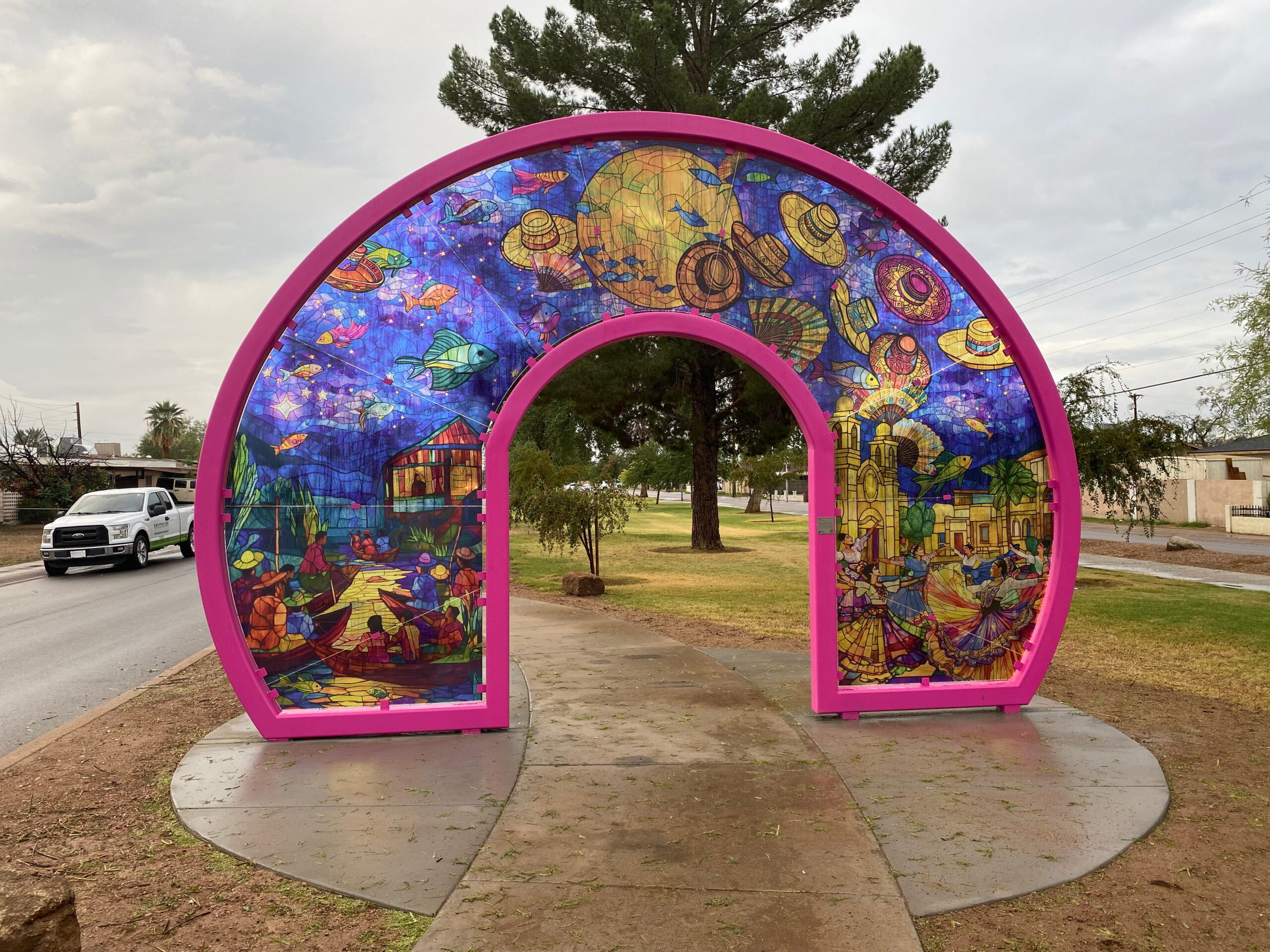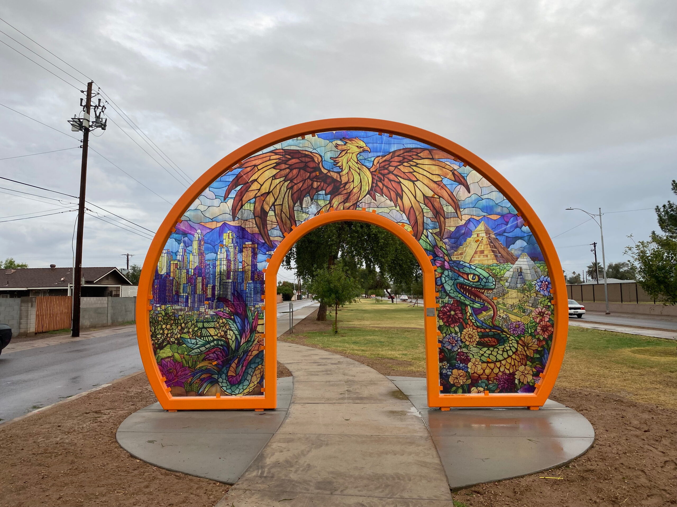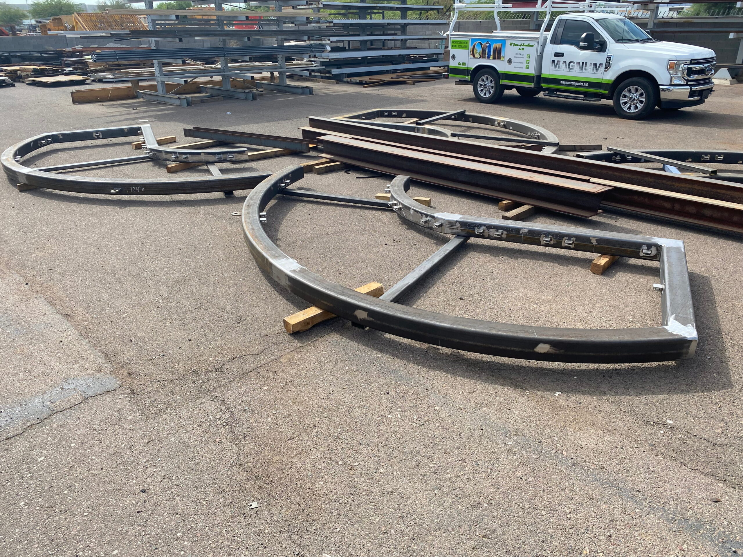 A public art installation in Phoenix featuring decorative arches showcased across three intersections for the City of Phoenix. The arches were constructed using roll-formed square tubing, with Magnum engineering a custom clamping solution for the acrylic panels by repurposing and modifying glass guardrail clamps. The assemblies were MIG welded, sandblasted, and finished with primer and paint for long-term durability.