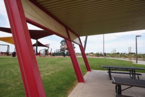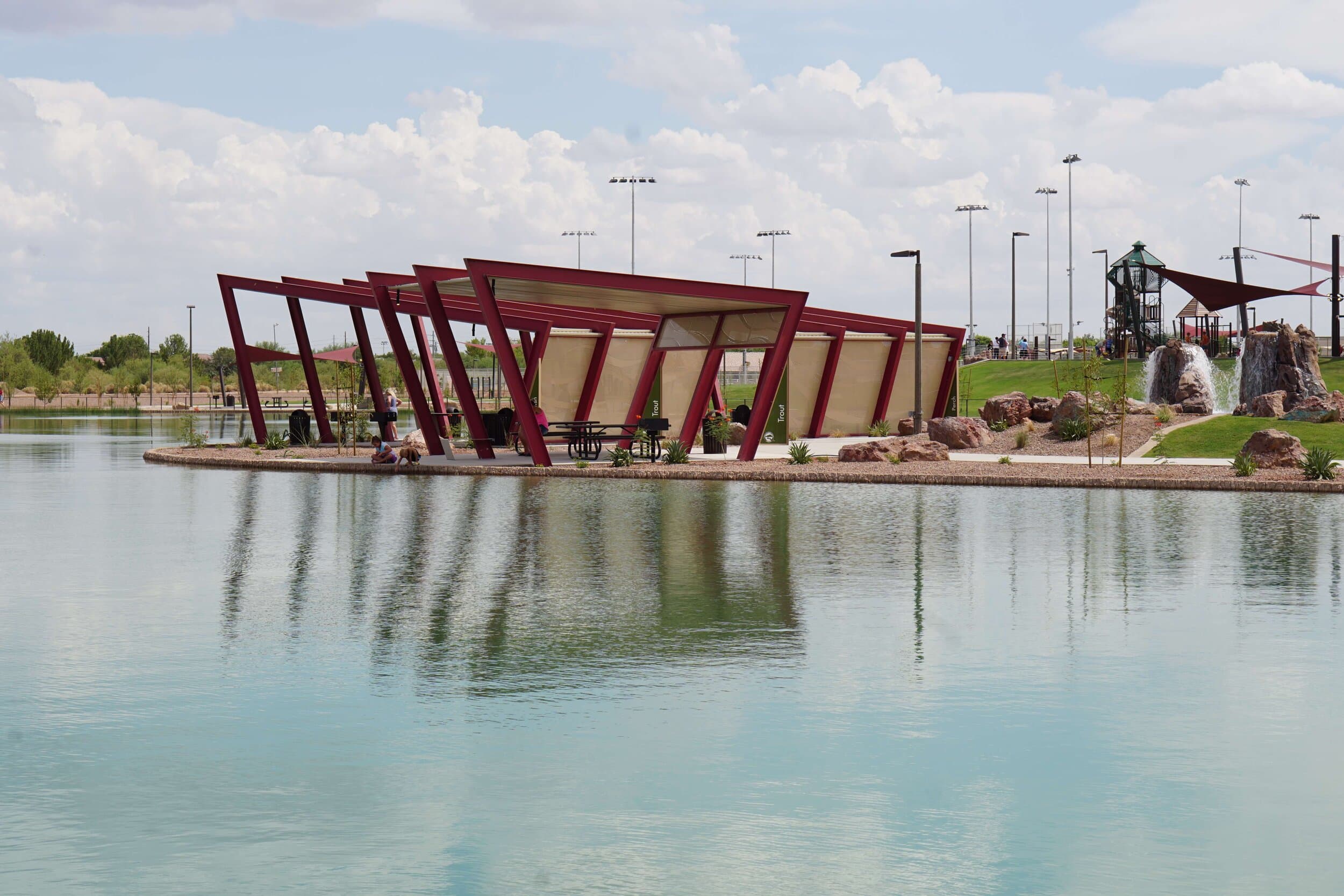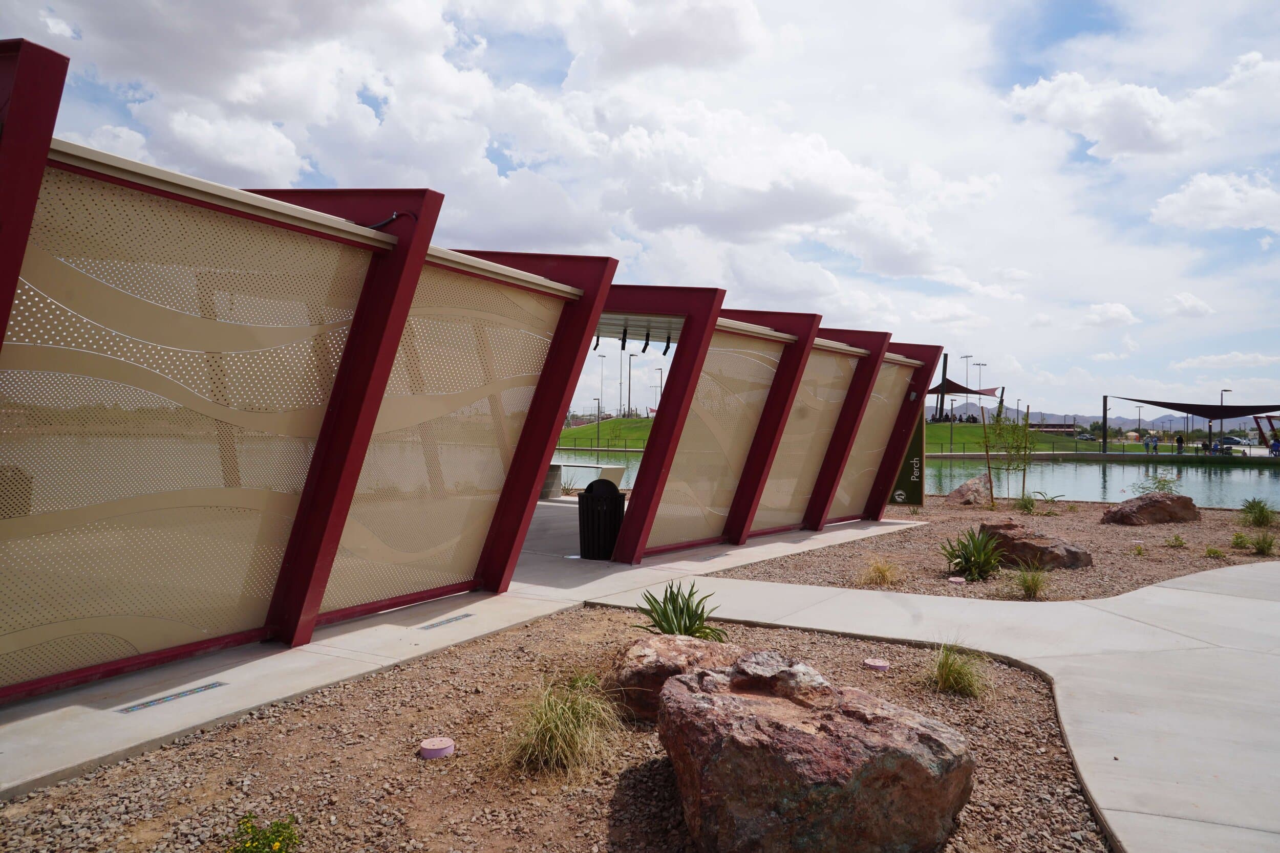 Custom aluminum perforated panels with a durable powder-coated finish, designed for the architectural ramadas surrounding the pond at Mansel Carter Oasis Park in Queen Creek, Arizona. These decorative panels combine functionality and aesthetic appeal, enhancing the park’s outdoor structures with a modern, durable design.