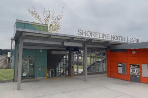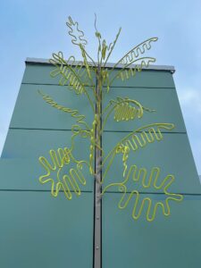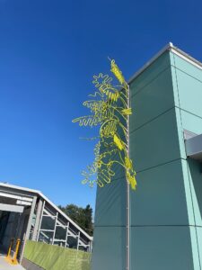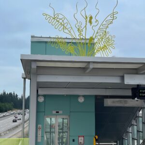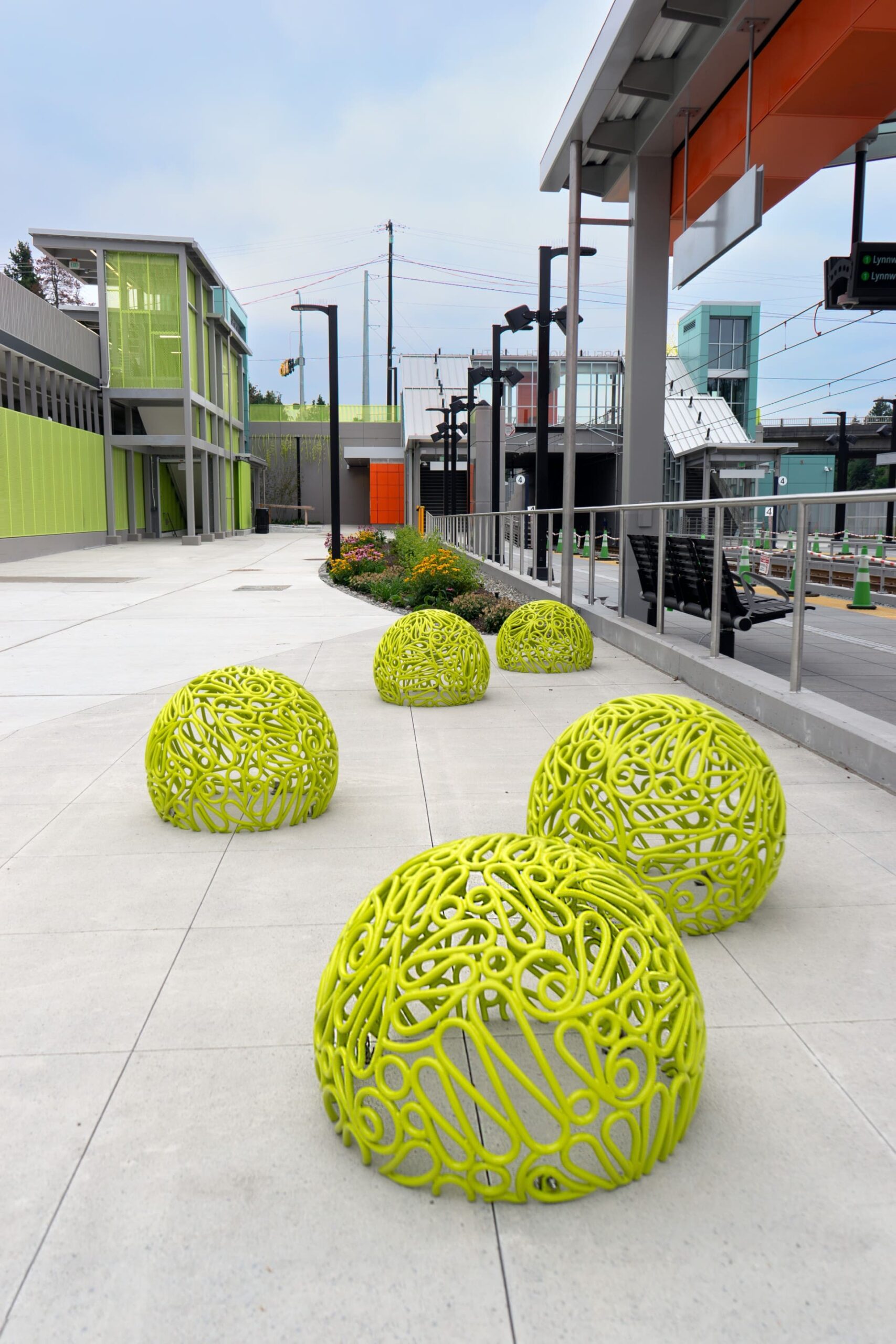 Vibrant neon-green, hand-forged metal forms bring nature to life at Shoreline North Train Station in Shoreline, Washington. Intricately shaped round bars create dynamic fern fronds and curling tendrils, while dome-like sculptural elements echo the same organic patterns along the plaza, adding a playful, modern interpretation of plant life to the station’s architecture.