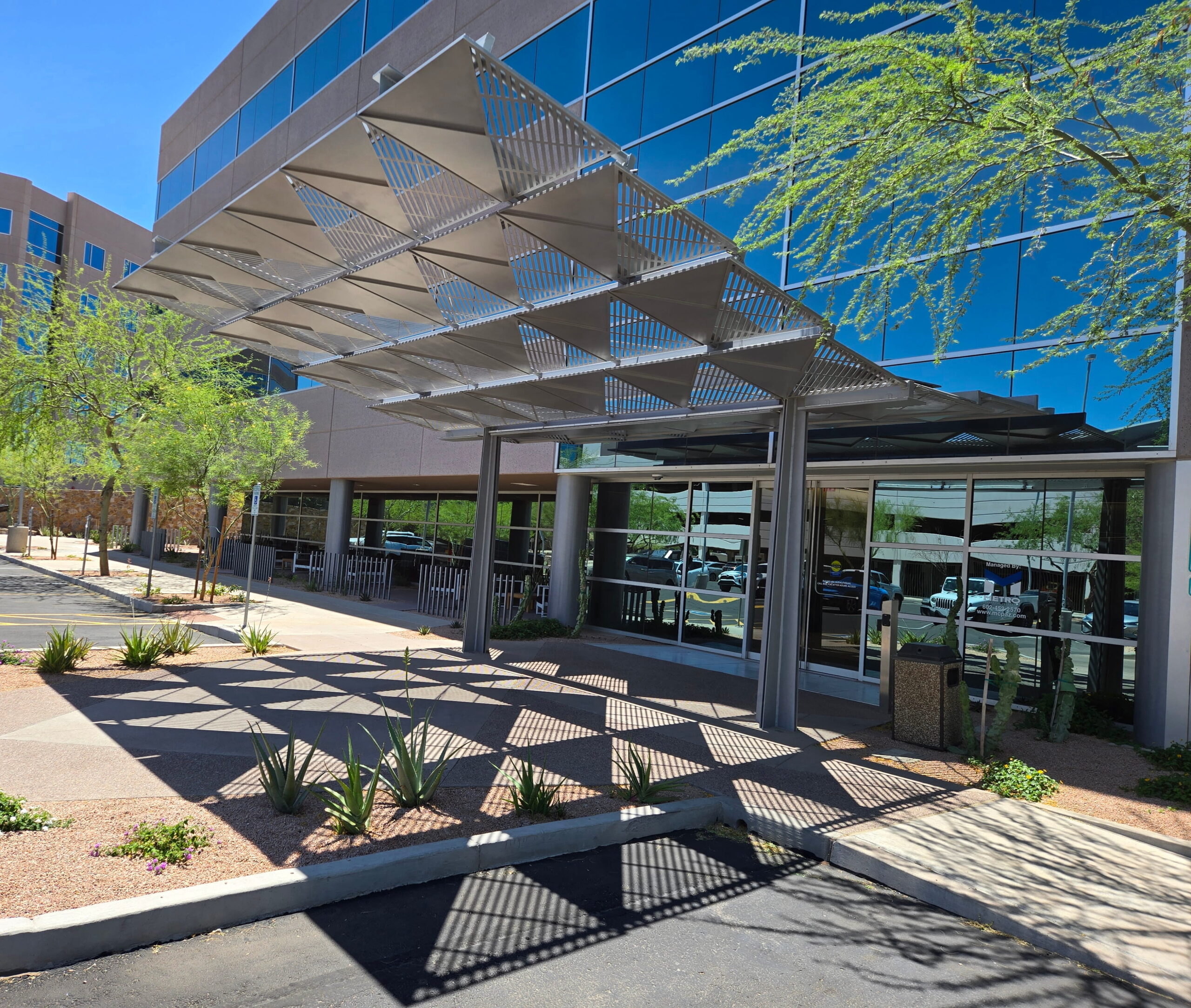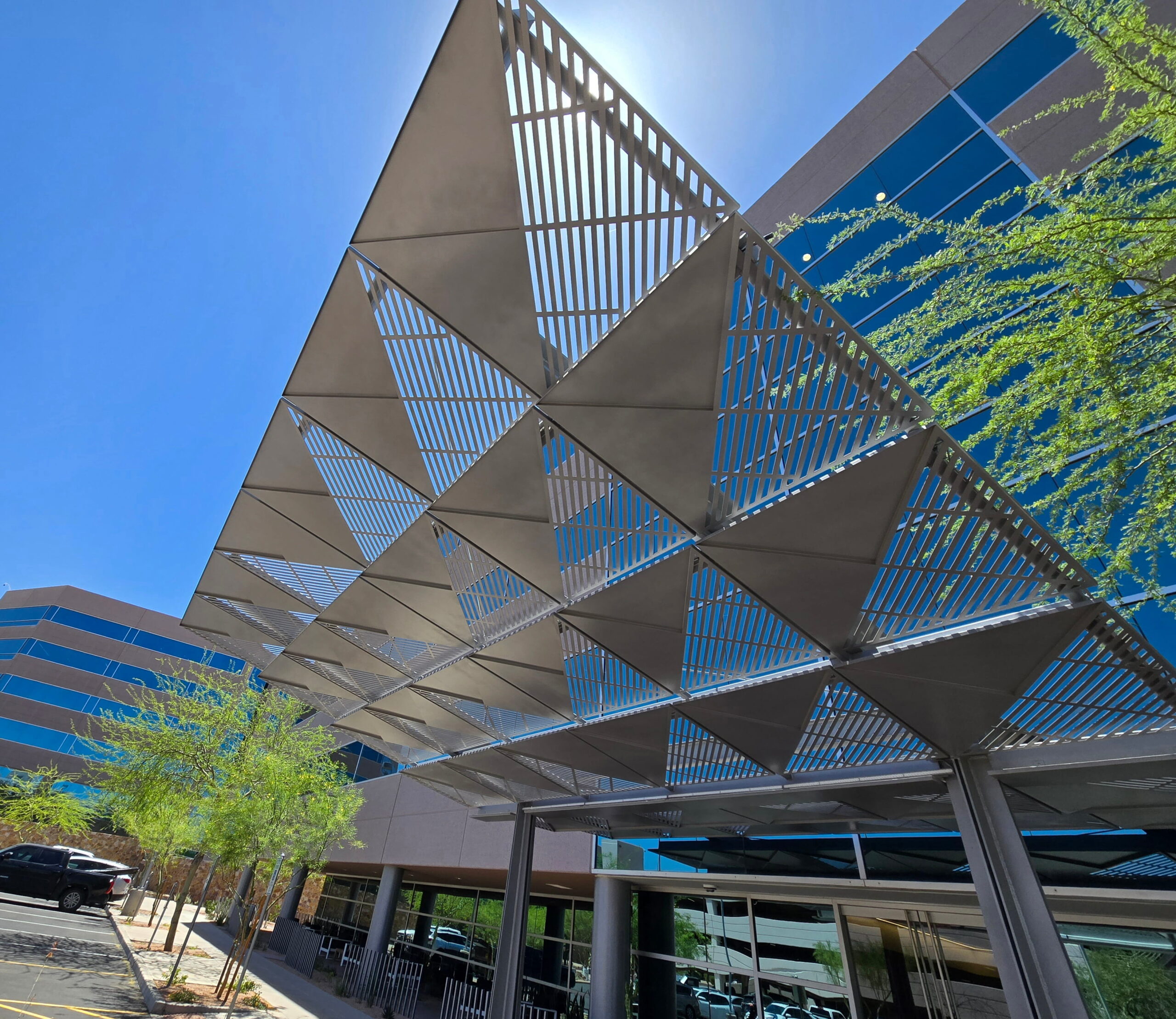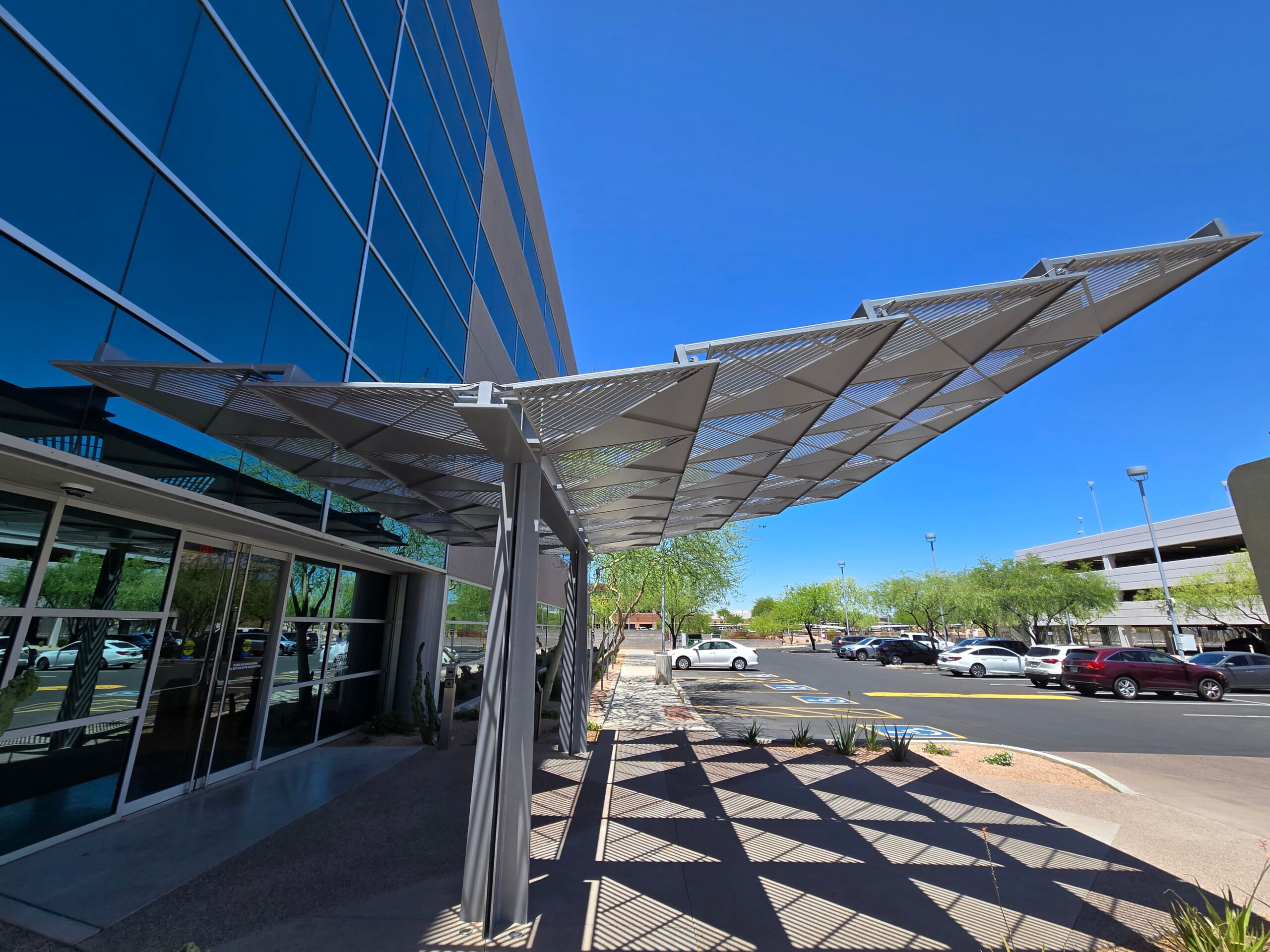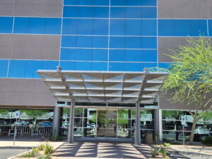 This project features a custom decorative aluminum canopy designed and fabricated for the main entrance of Papago Buttes Corporate Plaza. The canopy combines precision-cut aluminum panels with a modern geometric pattern, providing both functional shade and a visually striking architectural element. Engineered for durability and seamless integration with the building façade, the structure enhances the entry experience while reflecting a contemporary, high-end commercial aesthetic.