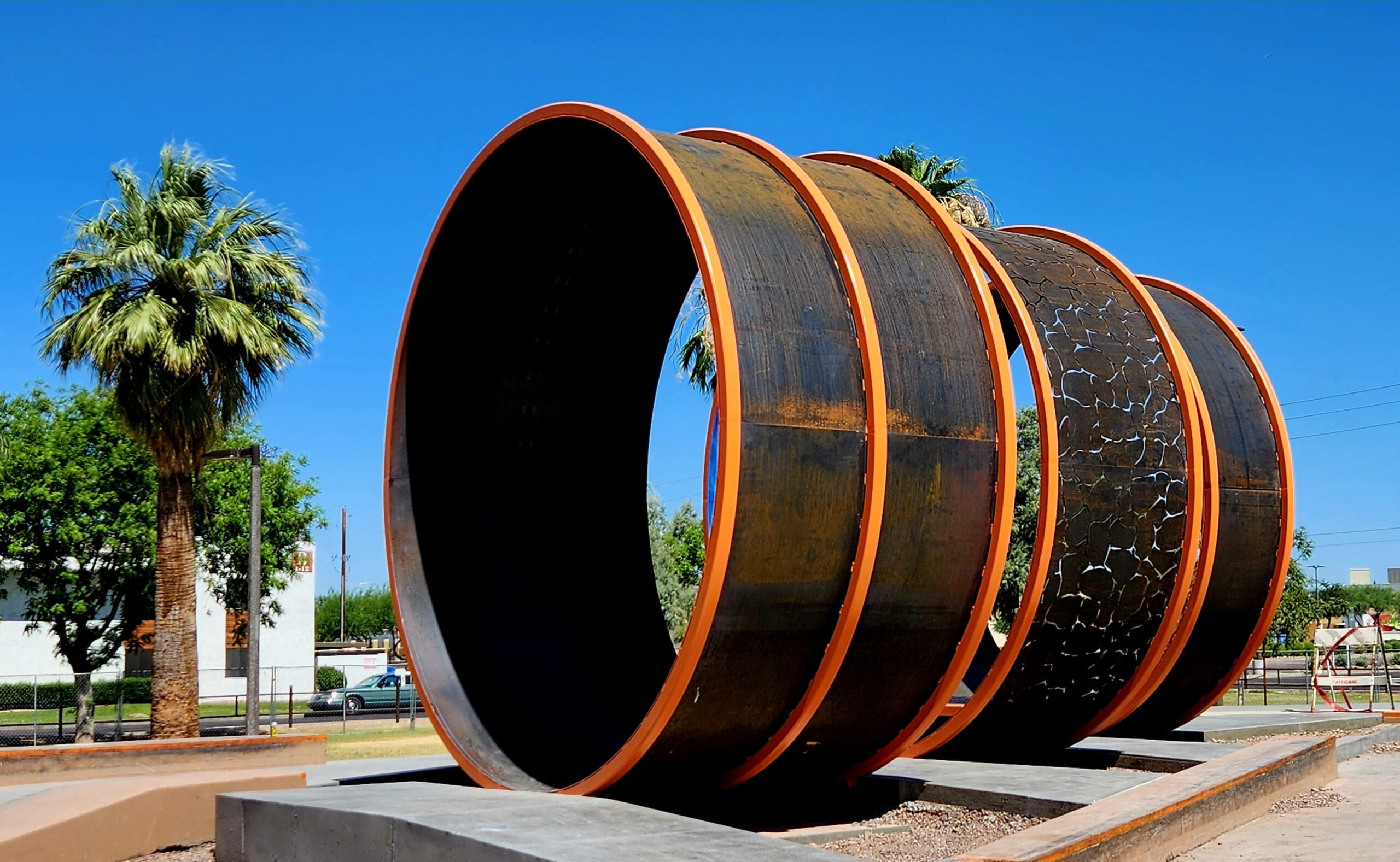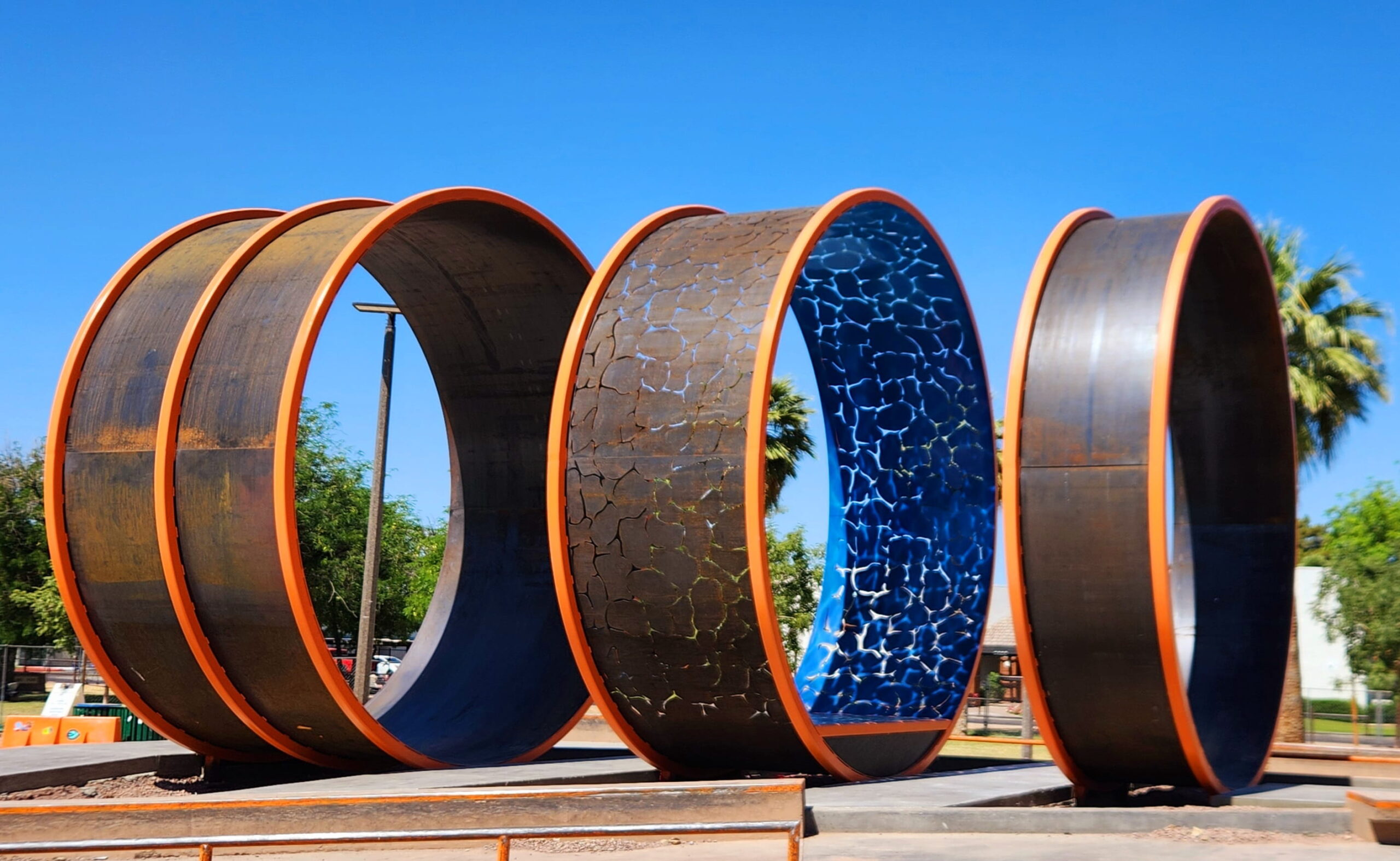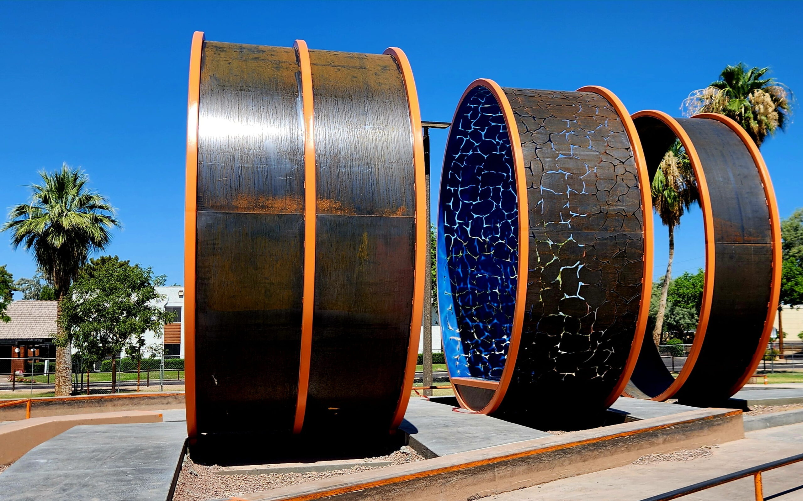 Pipe Dreams is an interactive sculpture at a skate park that nods to the legendary 1970s Arizona skate spot, Desert Pipes. Three big steel pipes give the park a striking visual punch, while also doubling as a skateable feature. The center pipe becomes a hangout spot, complete with a tiled bench and a perforated steel mural inspired by the swimming pools that were also a hotspot for skateboarding back in the day.