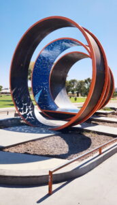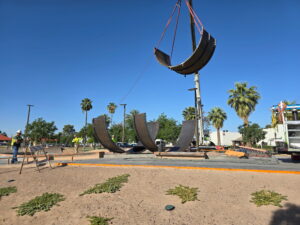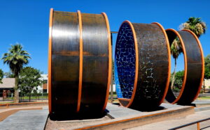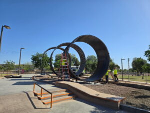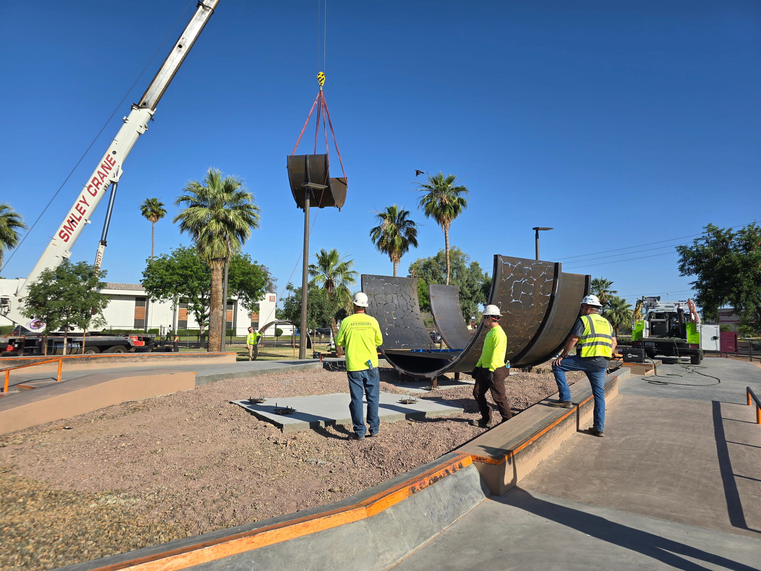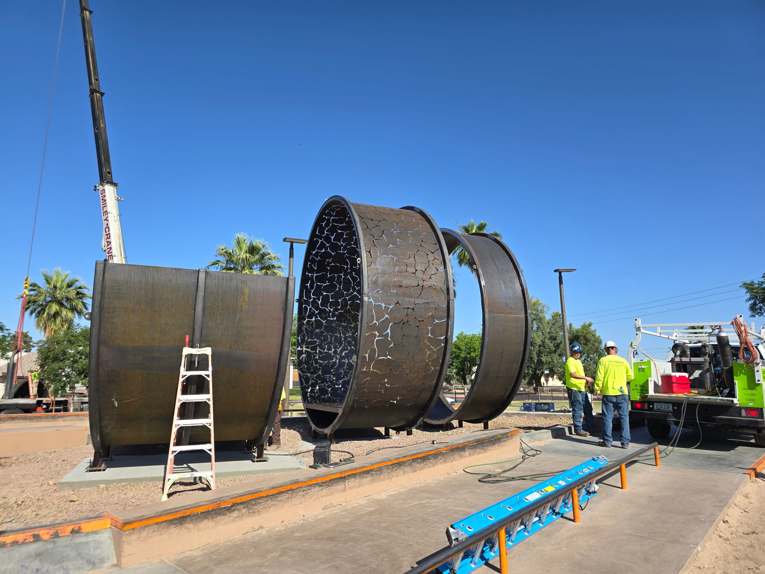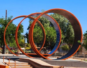 Pipe Dreams is an interactive sculpture at a skate park that nods to the legendary 1970s Arizona skate spot, Desert Pipes. Three big steel pipes give the park a striking visual punch, while also doubling as a skateable feature. The center pipe becomes a hangout spot, complete with a tiled bench and a perforated steel mural inspired by the swimming pools that were also a hotspot for skateboarding back in the day.