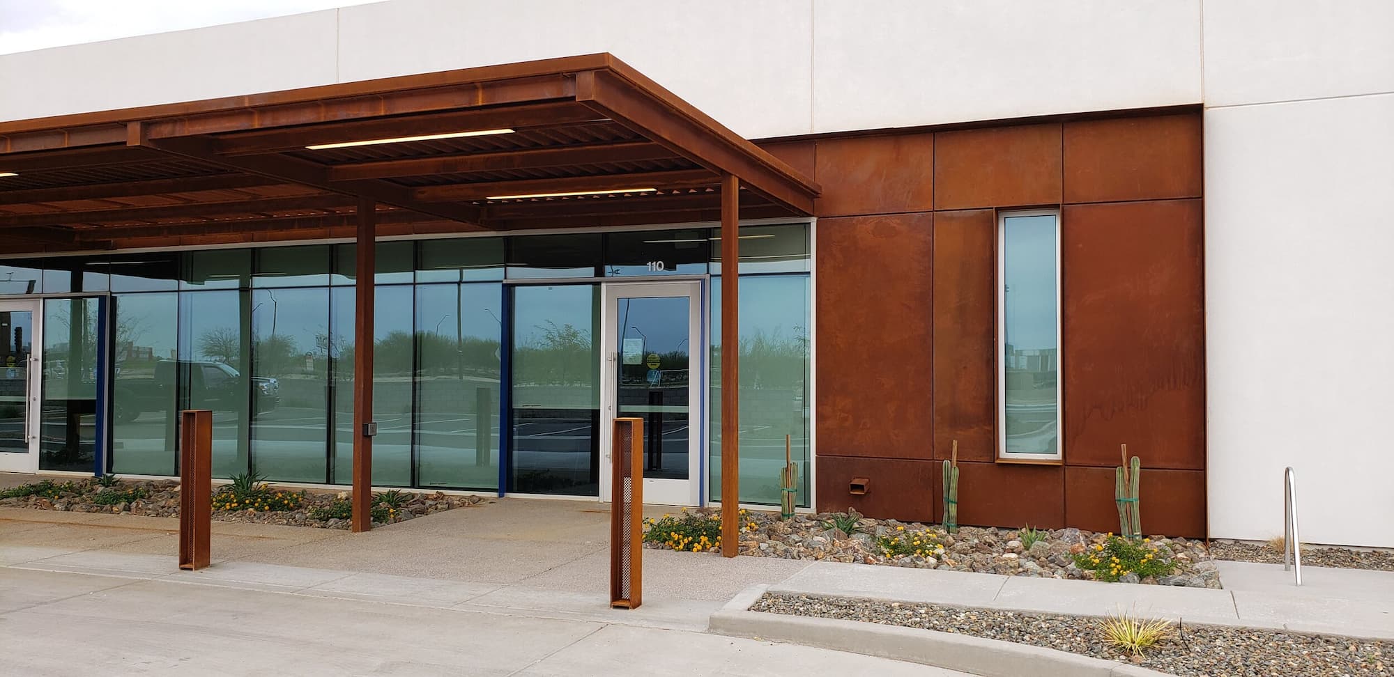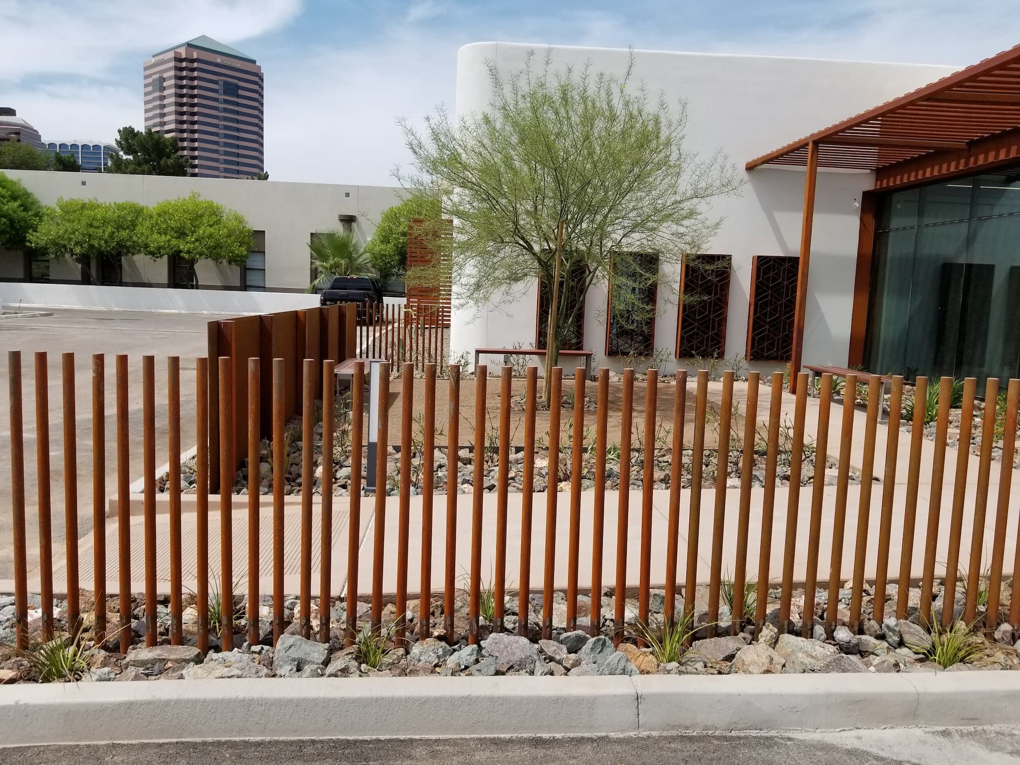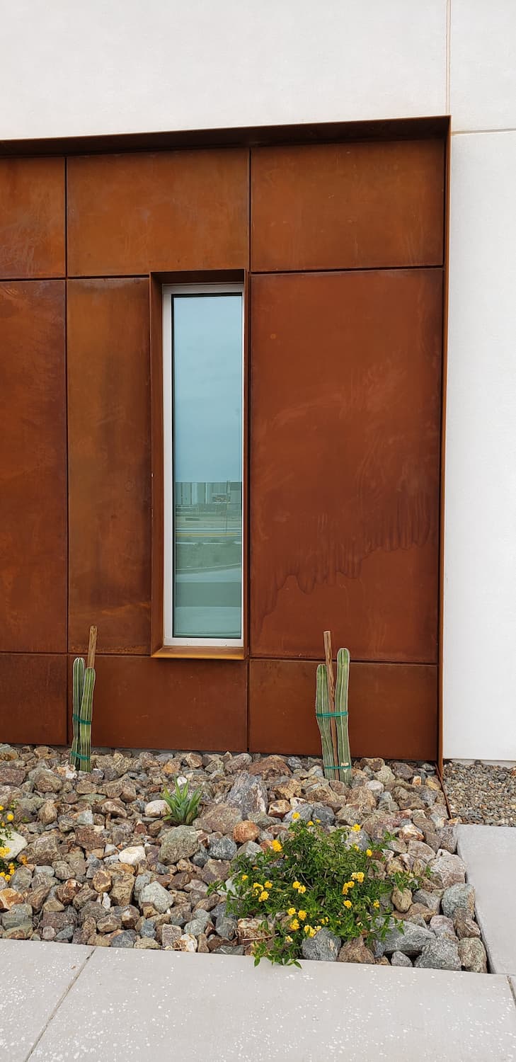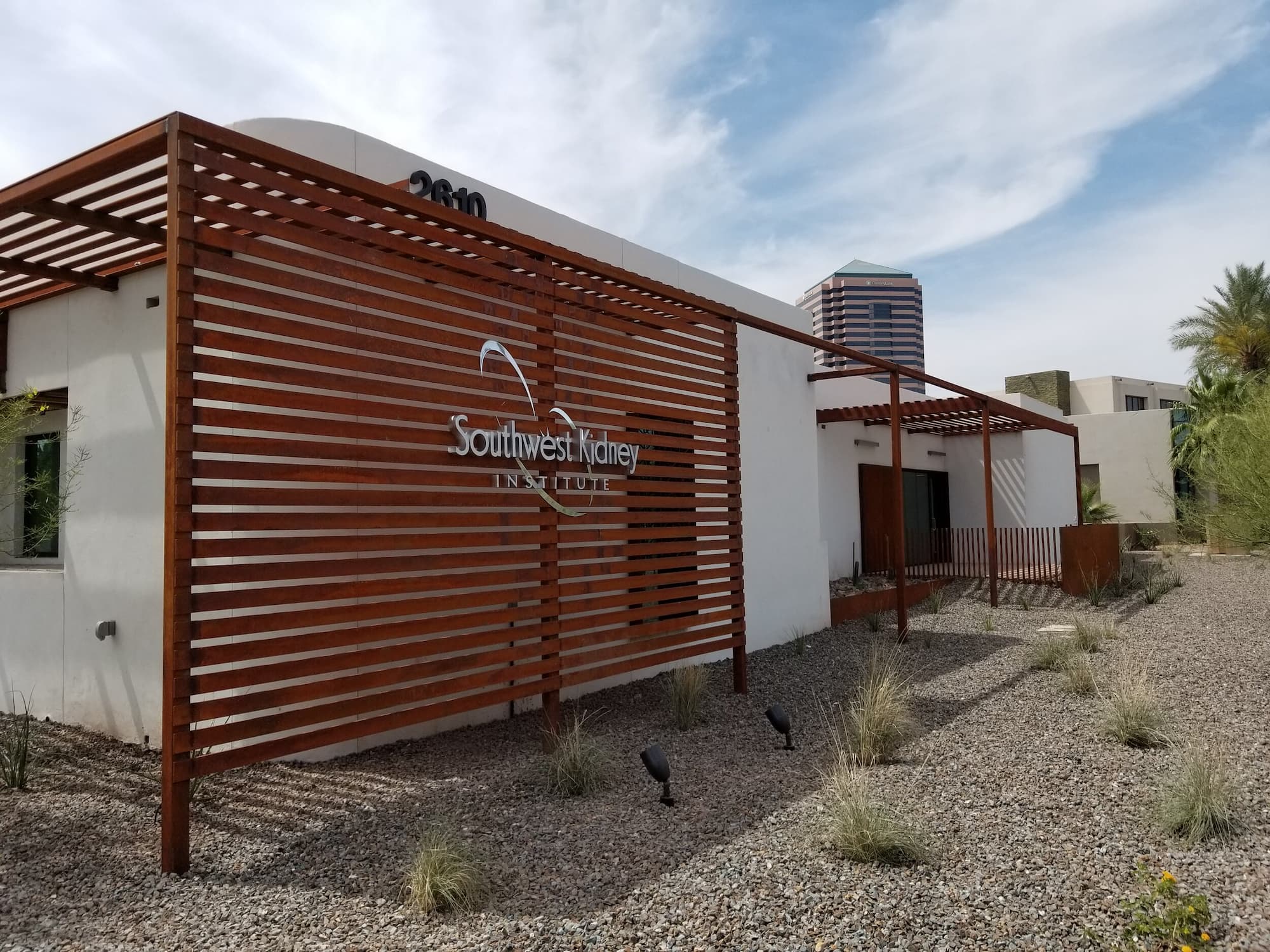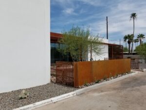 This project included a custom Corten steel pergola, awnings, and complementary Corten architectural accents fabricated for the Southwest Kidney Institute, designed by SmithGroup. The warm, weathered steel elements provide shade, privacy, and visual continuity throughout the site, blending durability with a refined desert-modern aesthetic that enhances the building’s exterior and surrounding landscape.