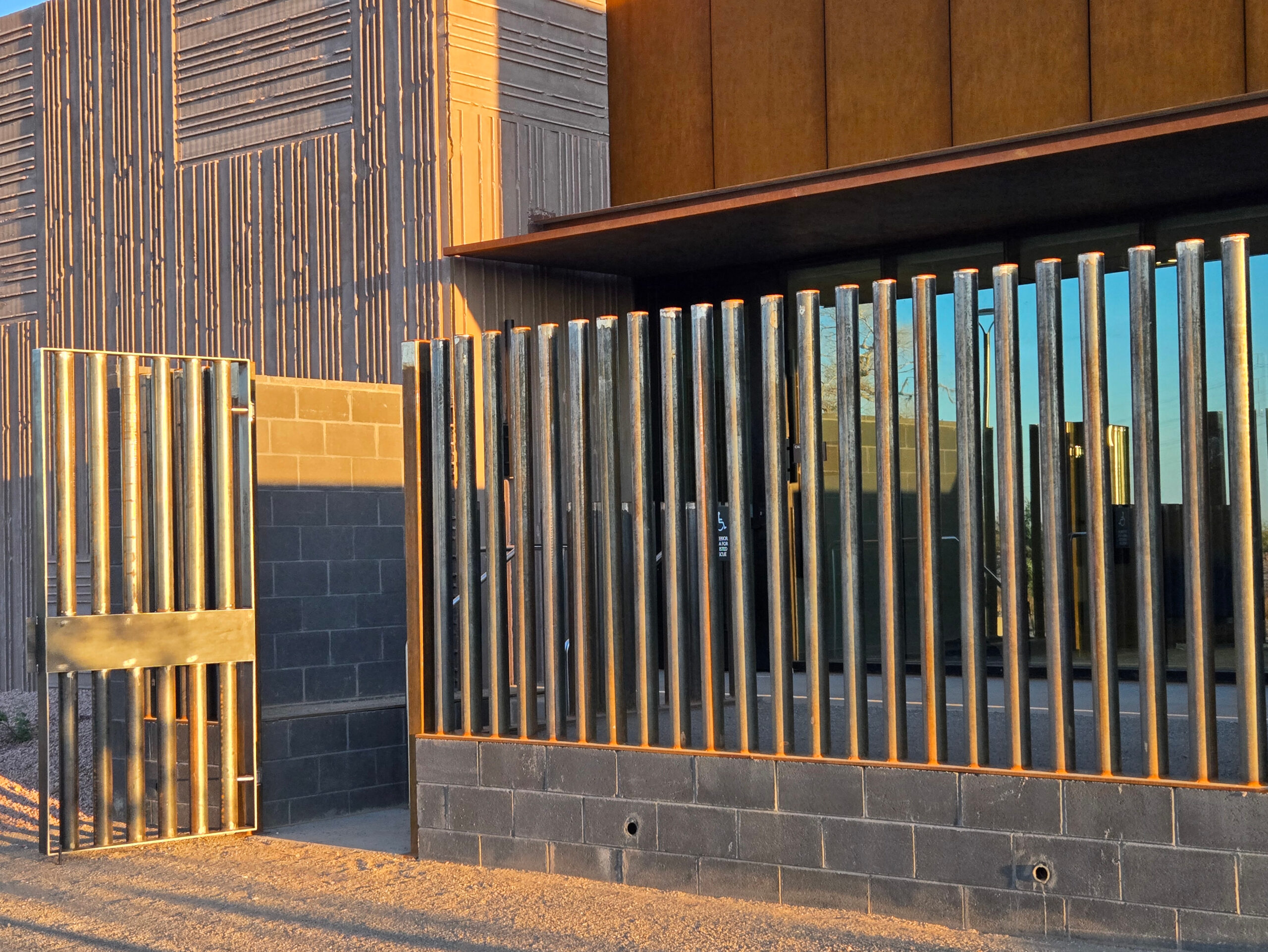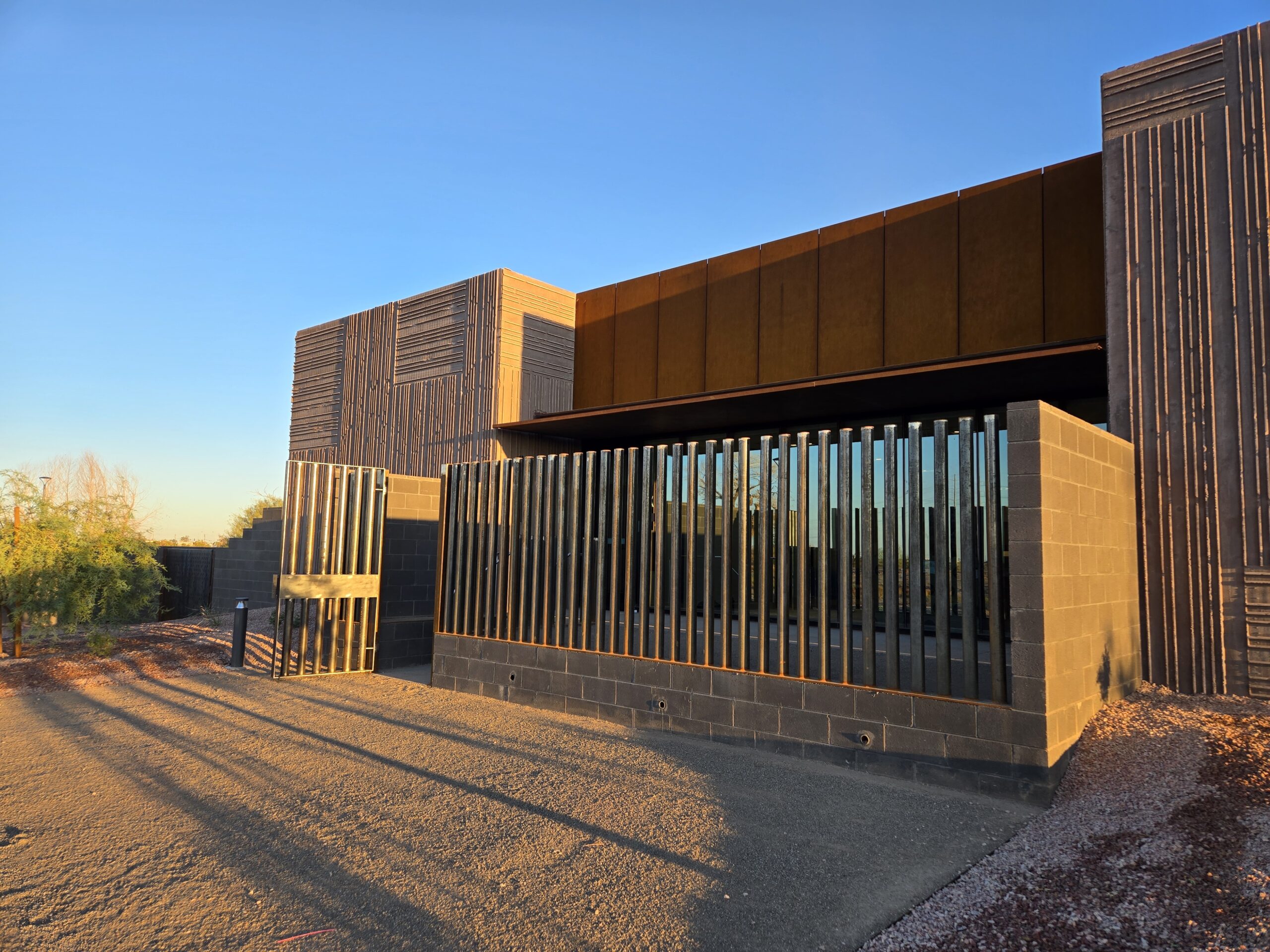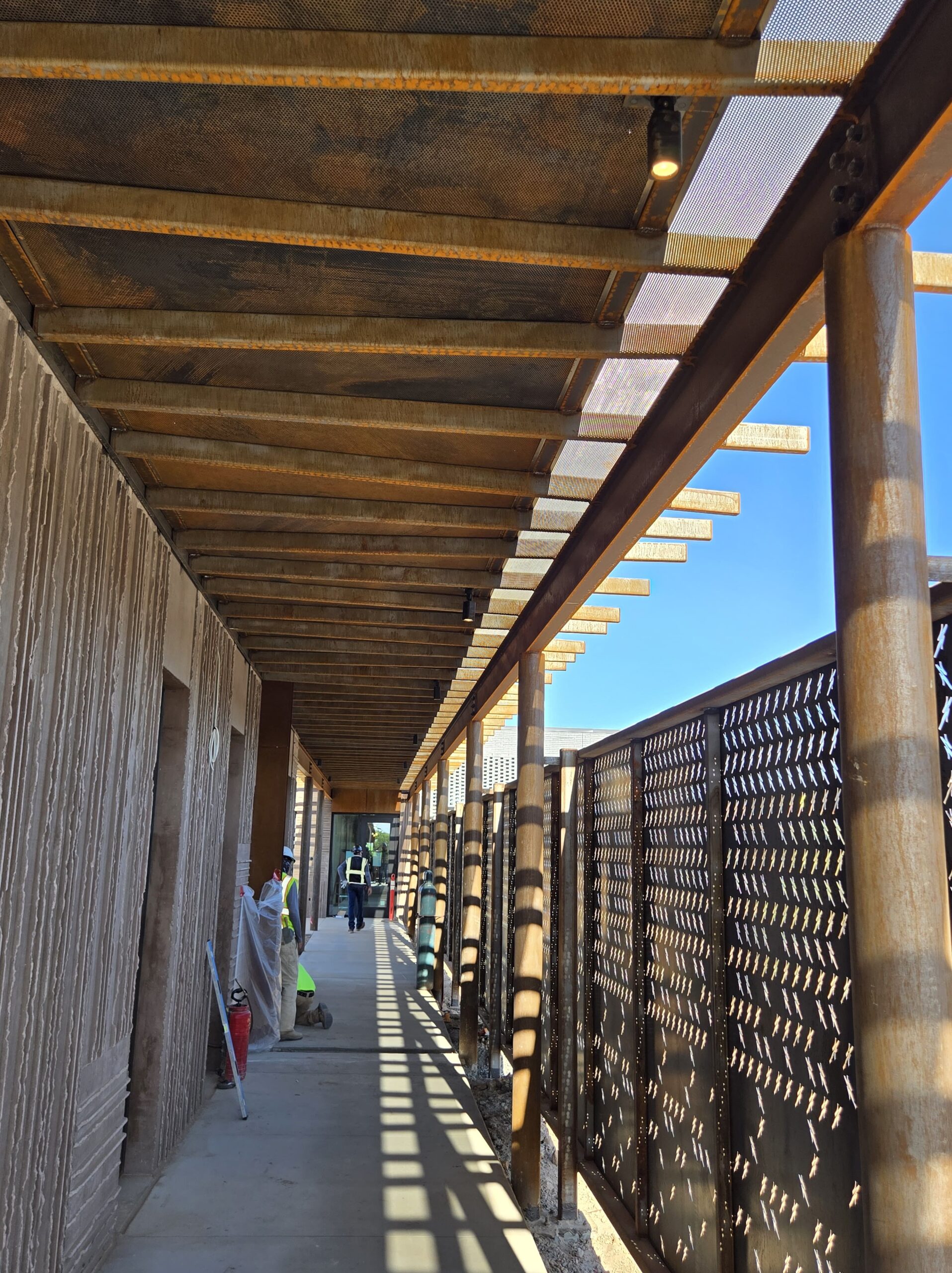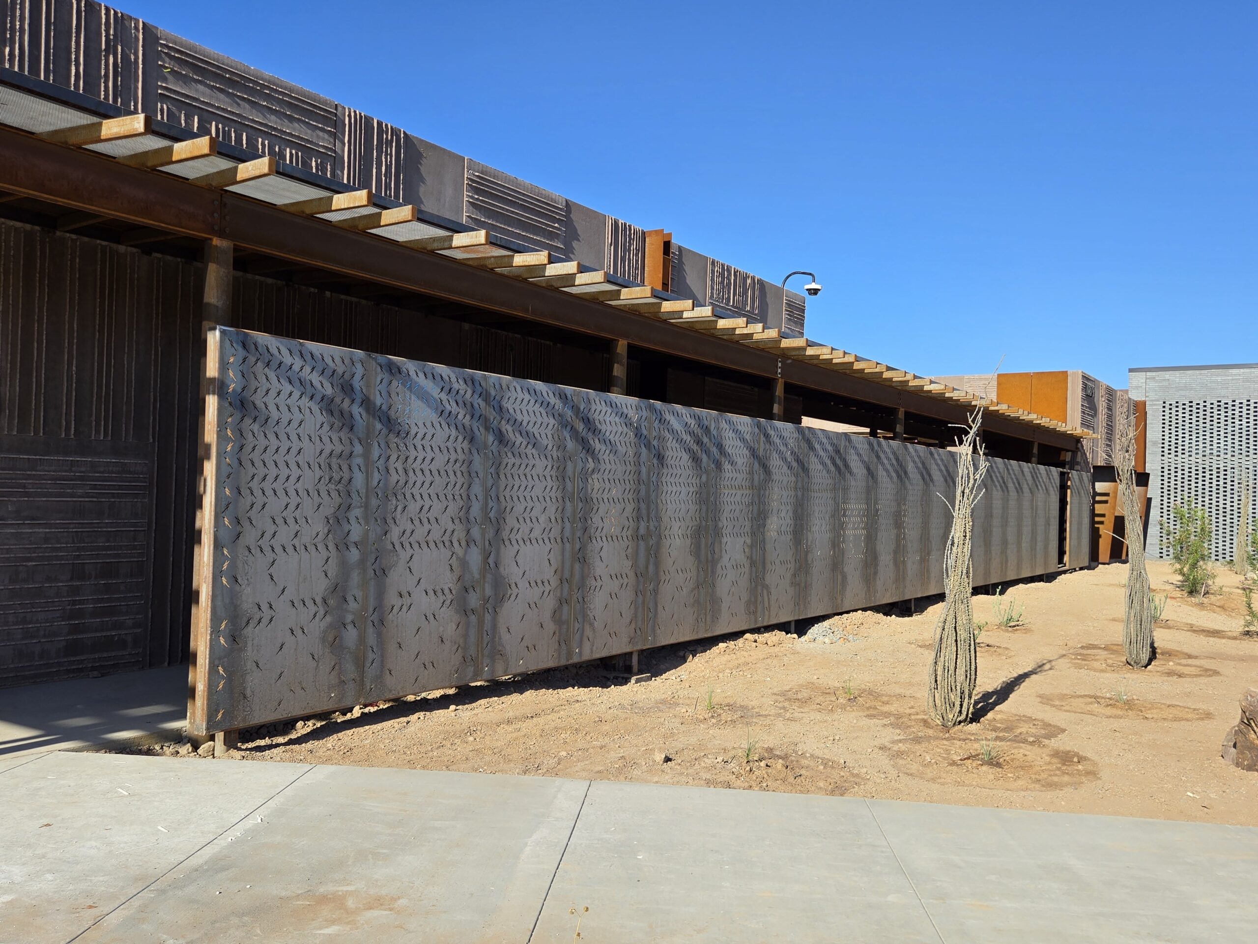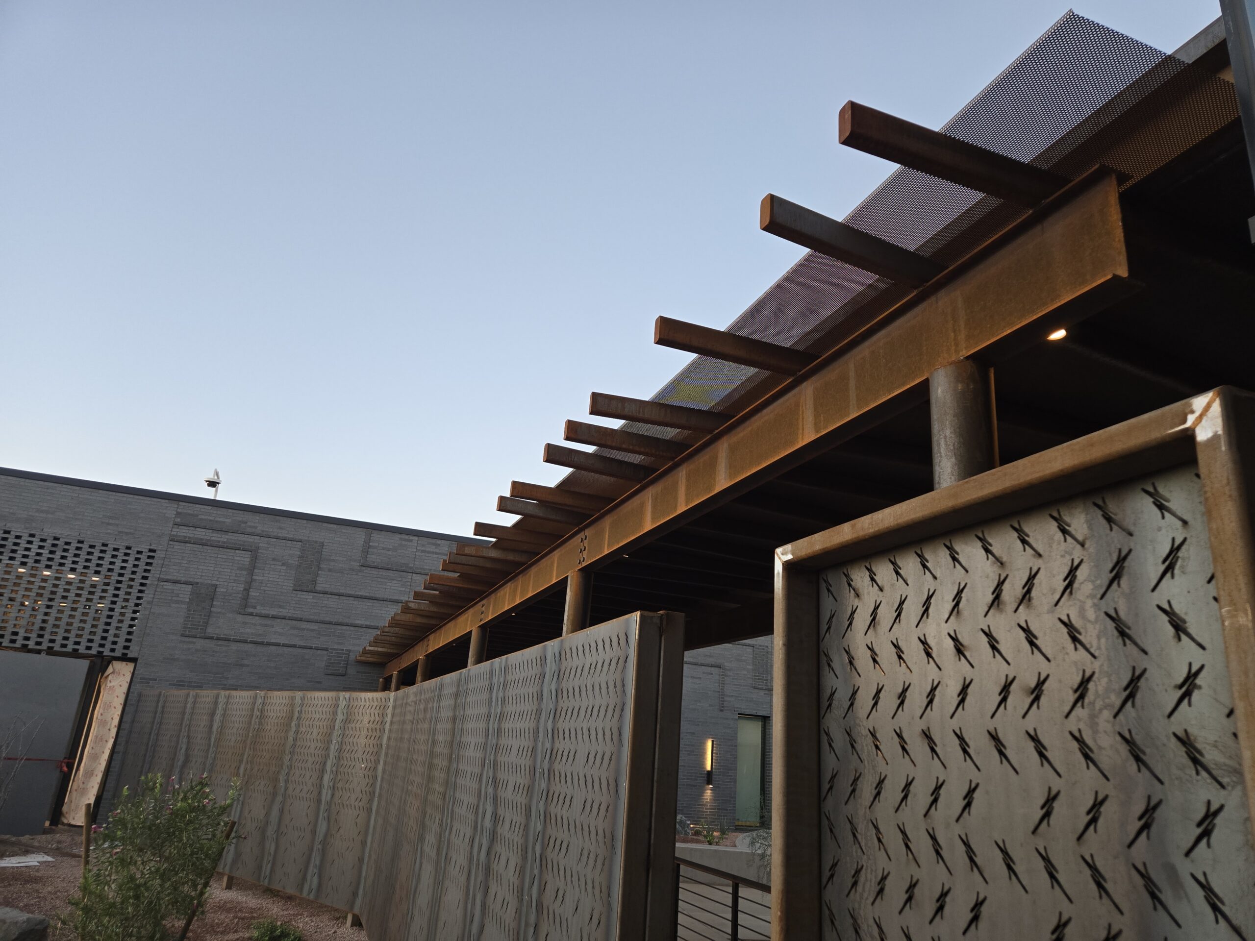 For the Salt River Pima–Maricopa Indian Community’s Journey to Recover Rehabilitation Center, we fabricated and installed a comprehensive suite of custom architectural Corten steel elements, including window shading, privacy screening, gates, pergolas, awnings, and canopies. The work integrated layered 16-ga Corten perforated sheet with 2″ × 4″ Corten rectangular tubing, concealed mechanical raceways with 11-ga Corten lids, and select 14-ga laser-cut privacy panels featuring Native American–inspired bird motifs. The result is a cohesive campus-wide installation that balances durability, shade, function, and cultural expression.