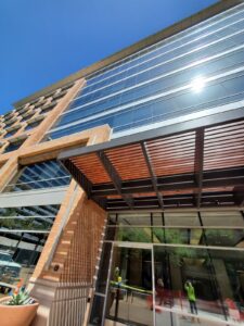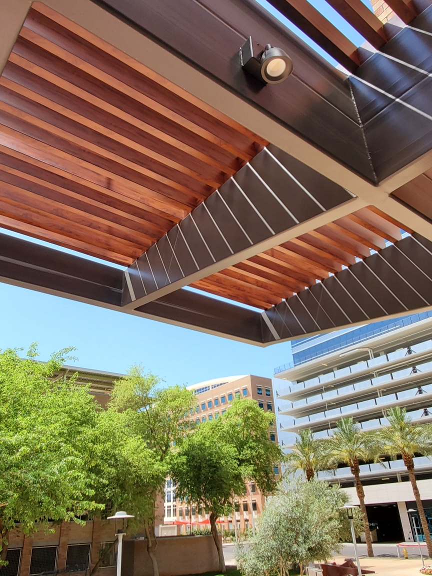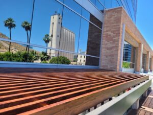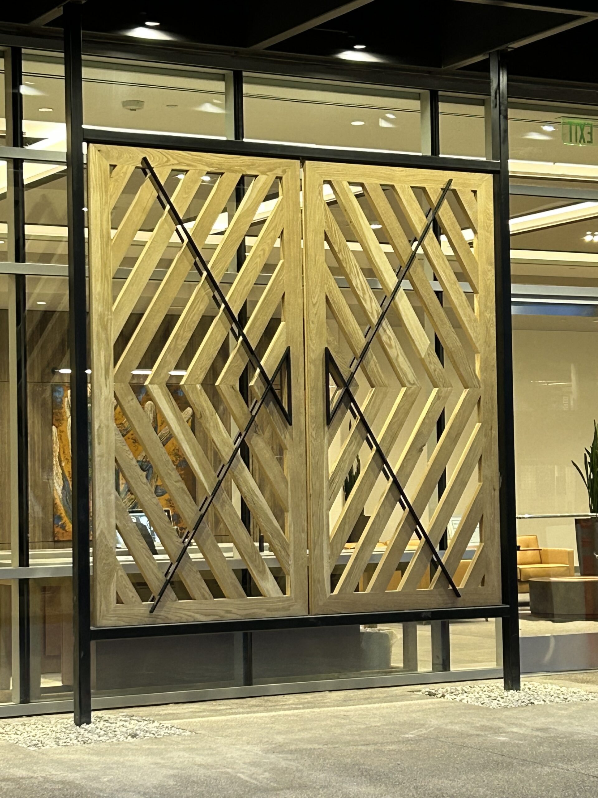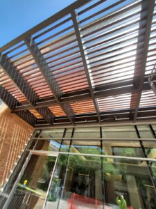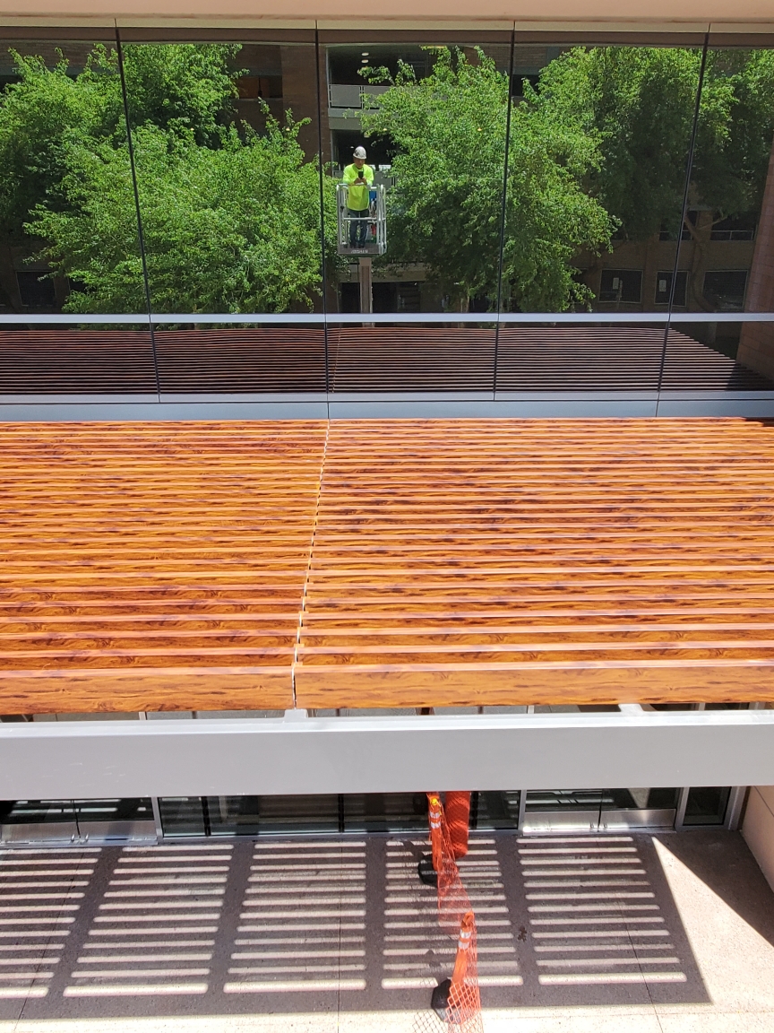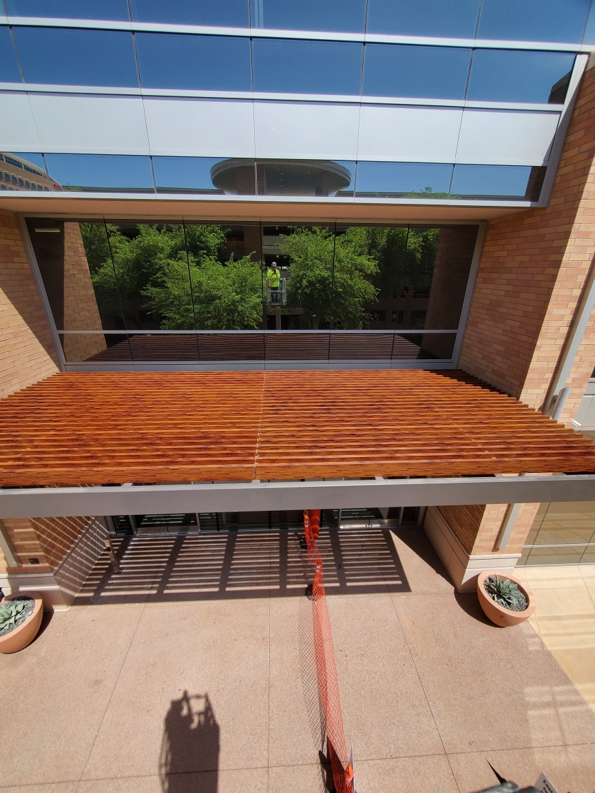 Two decorative awnings built from Knotwood, aluminum rectangular tubing painted to look like wood, along with the frame work for the two custom lobby screens designed to reduce sunlight flooding at sunrise and sunset. The combination provides functional shading while enhancing both the exterior and interior aesthetics of the building.