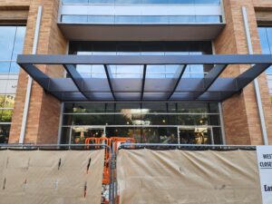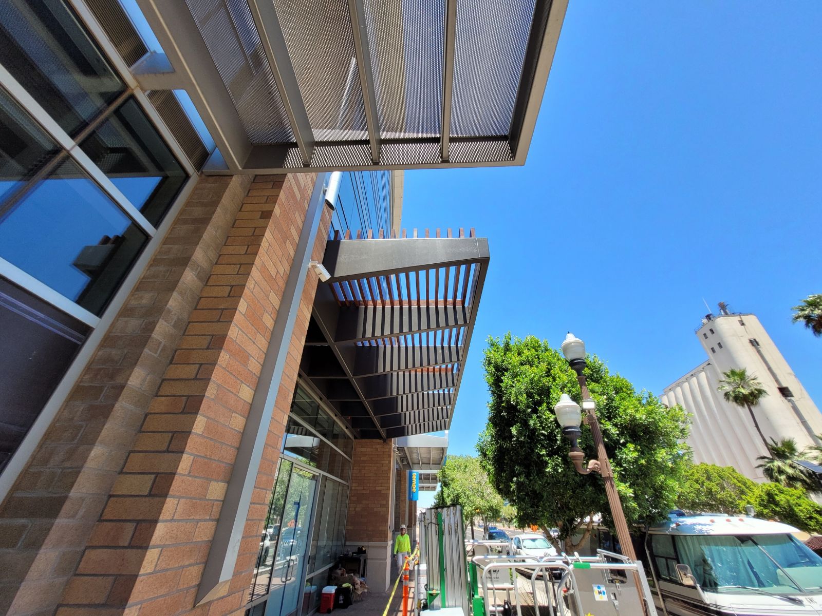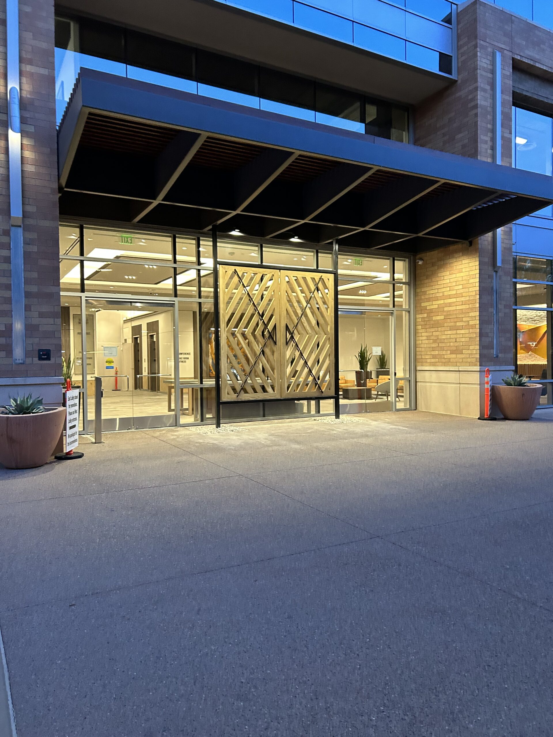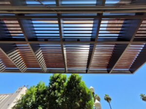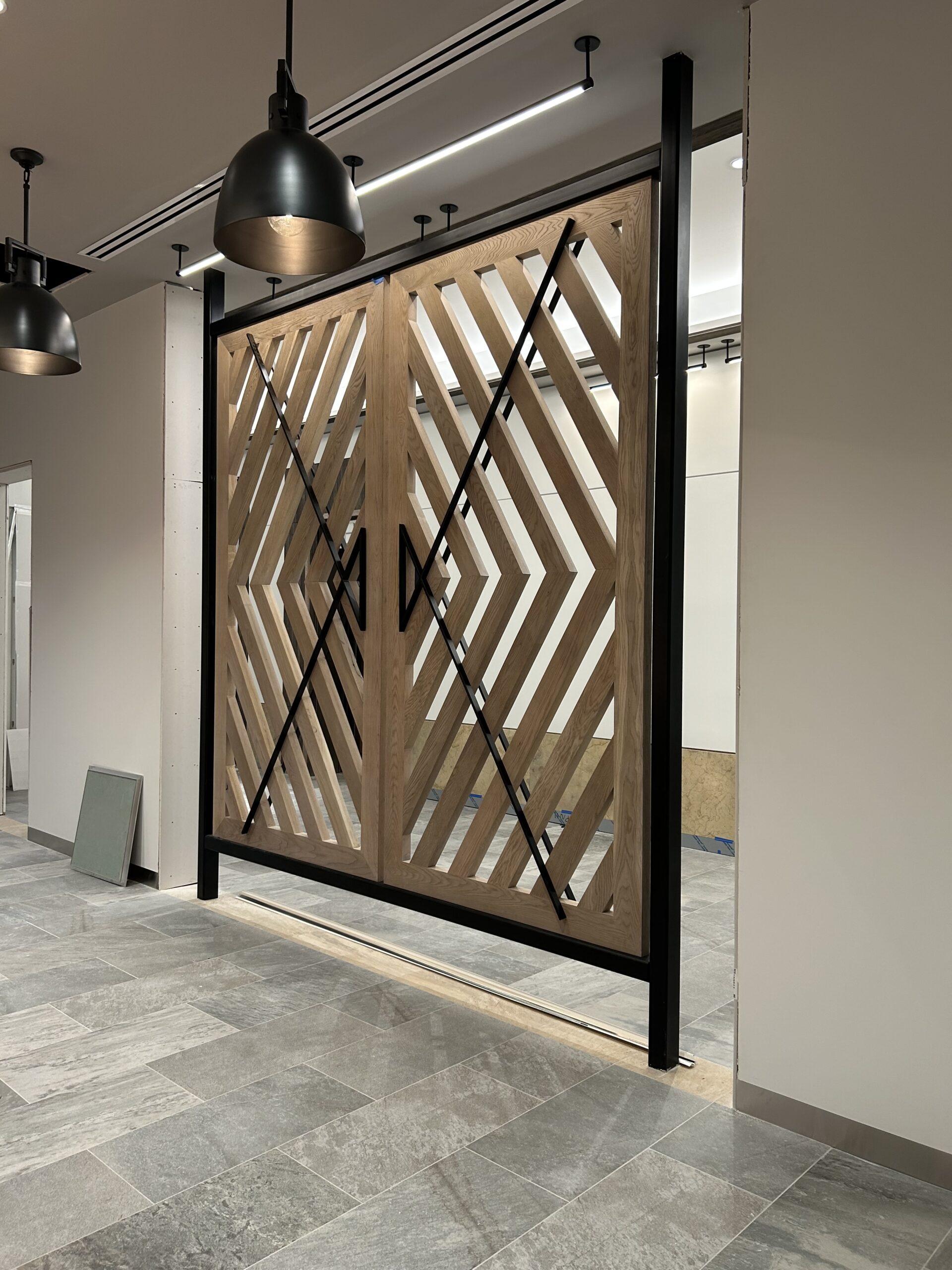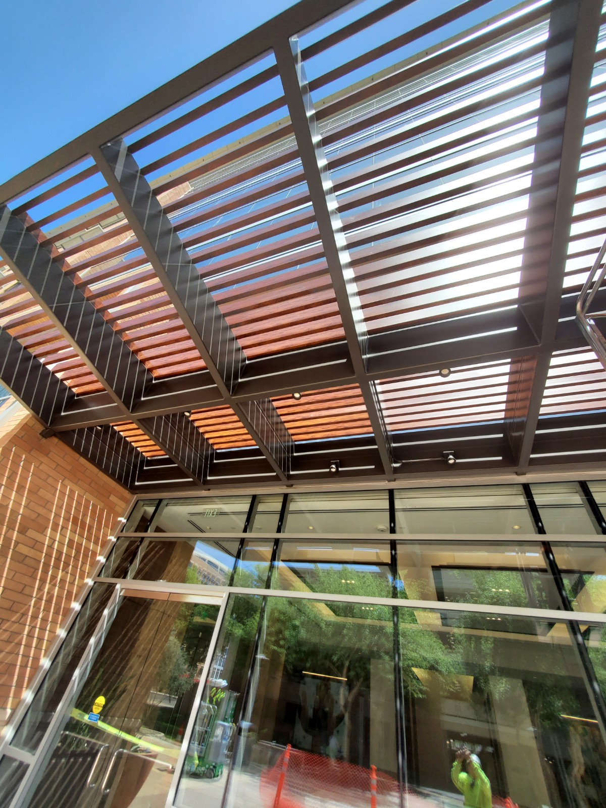 Two decorative awnings built from Knotwood, aluminum rectangular tubing painted to look like wood, along with the frame work for the two custom lobby screens designed to reduce sunlight flooding at sunrise and sunset. The combination provides functional shading while enhancing both the exterior and interior aesthetics of the building.