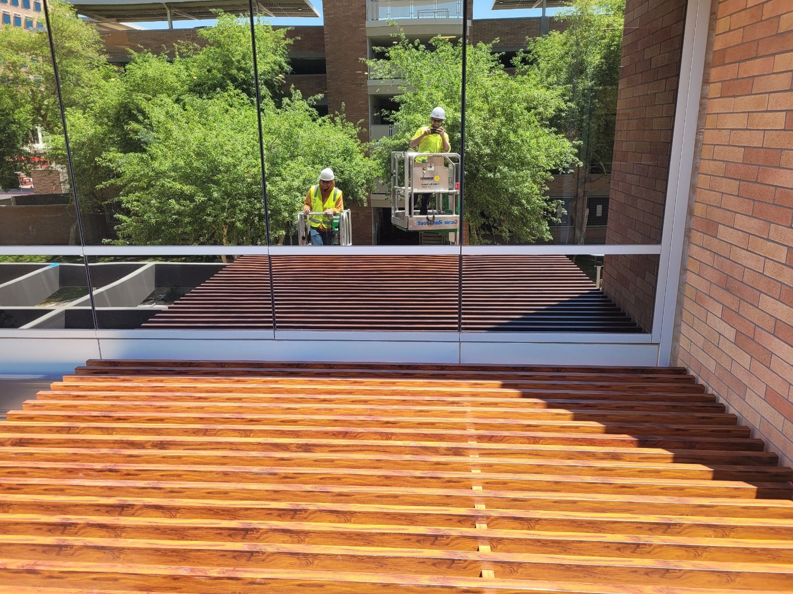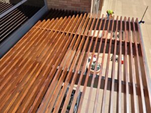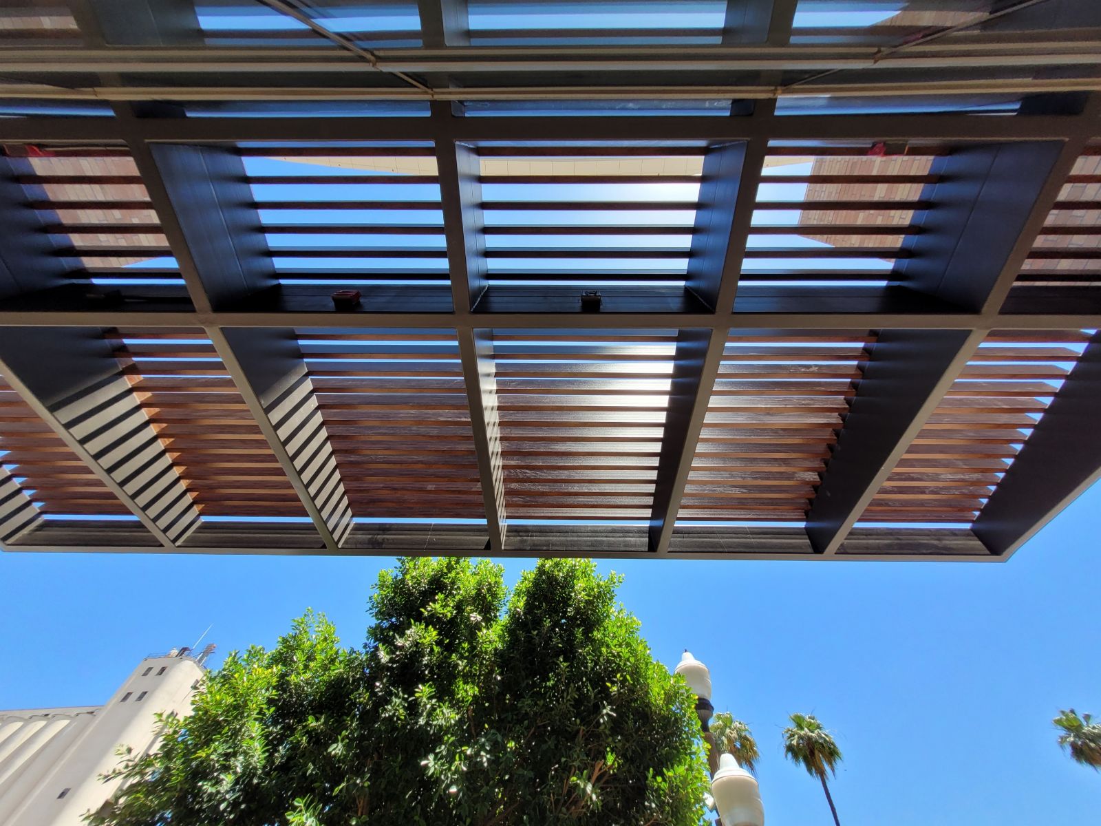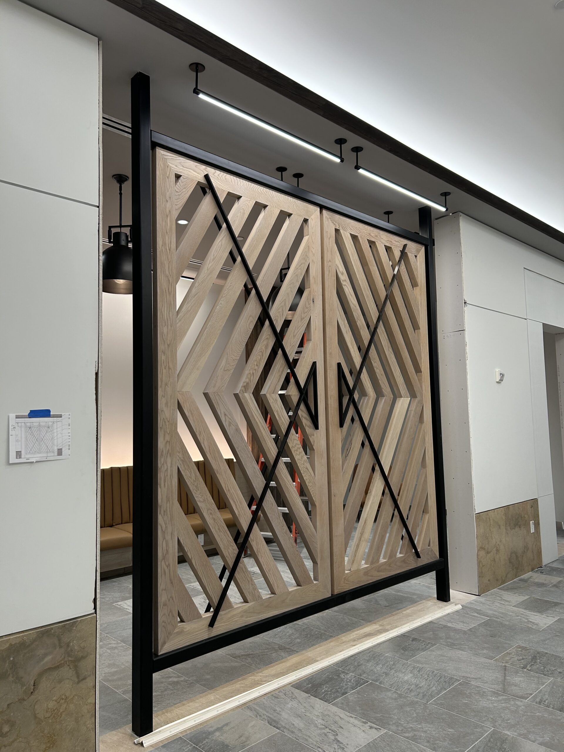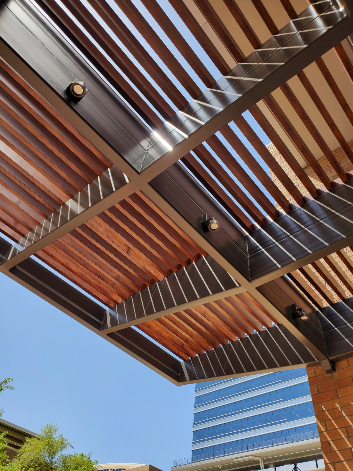 Two decorative awnings built from Knotwood, aluminum rectangular tubing painted to look like wood, along with the frame work for the two custom lobby screens designed to reduce sunlight flooding at sunrise and sunset. The combination provides functional shading while enhancing both the exterior and interior aesthetics of the building.