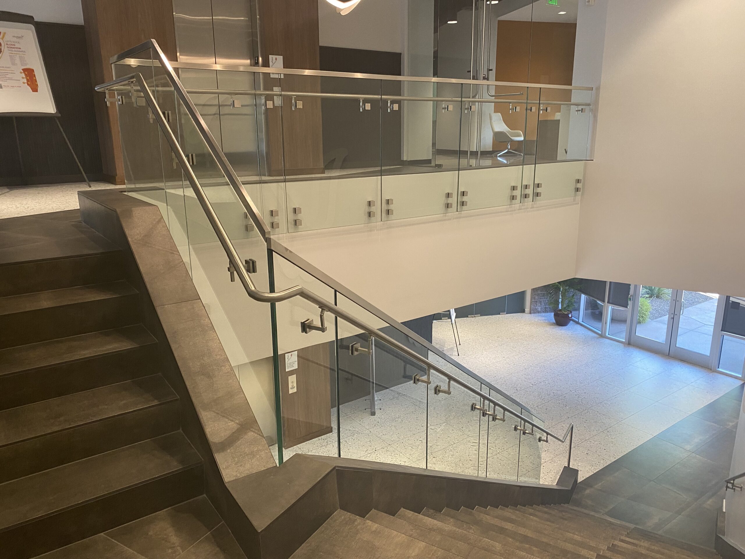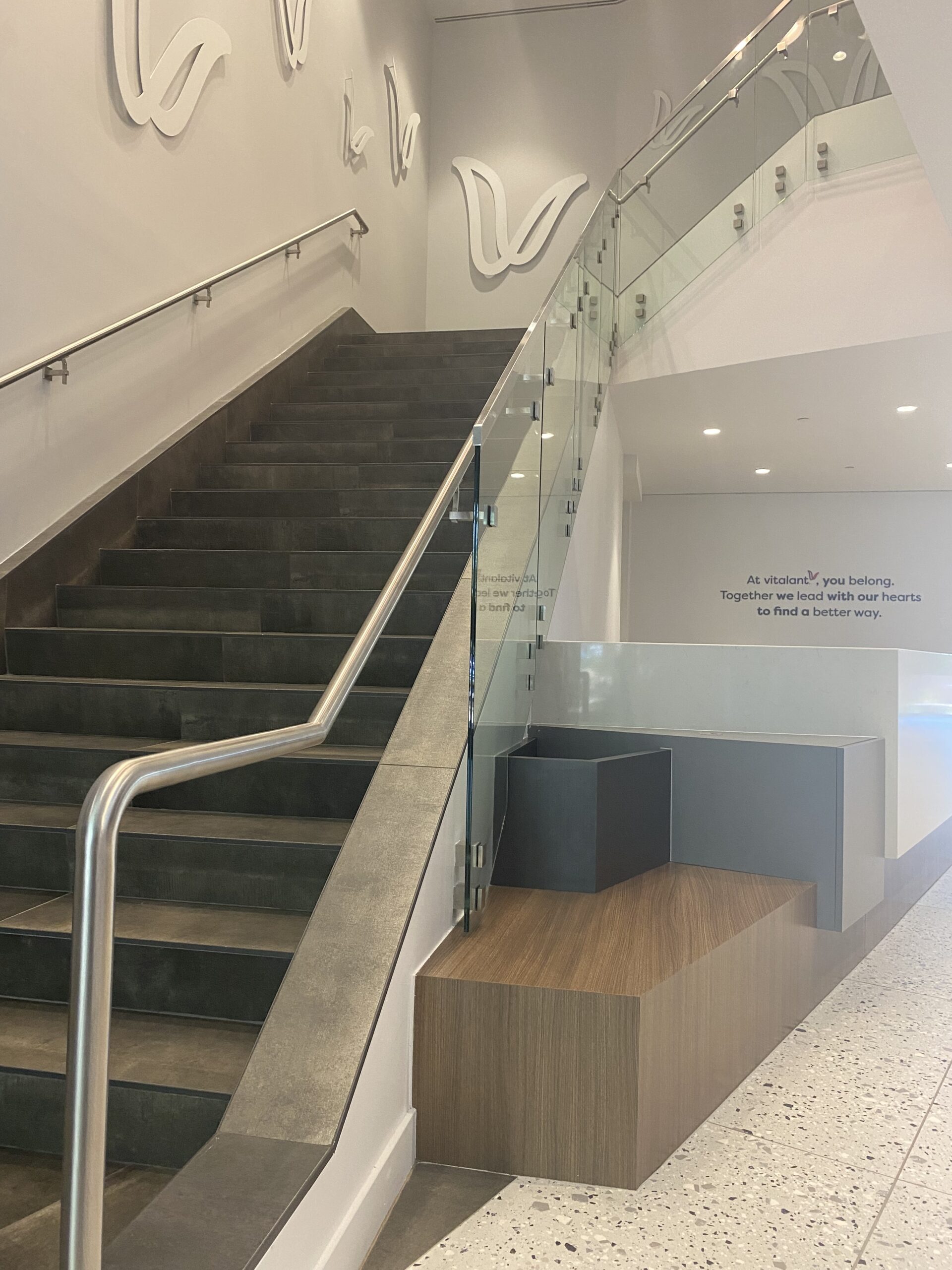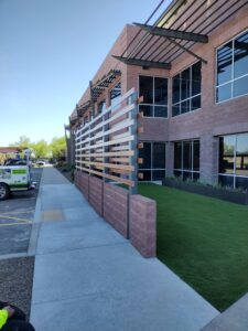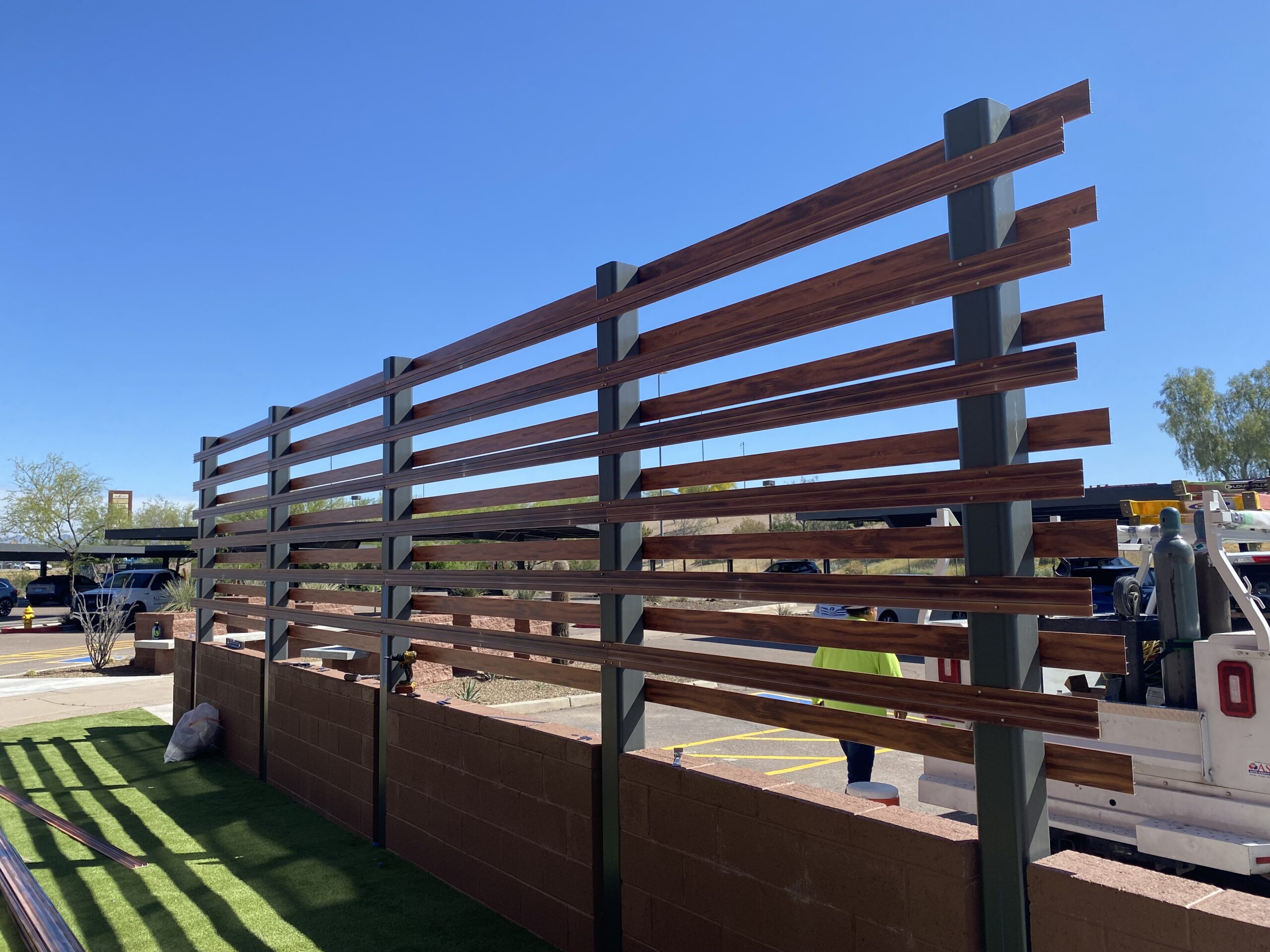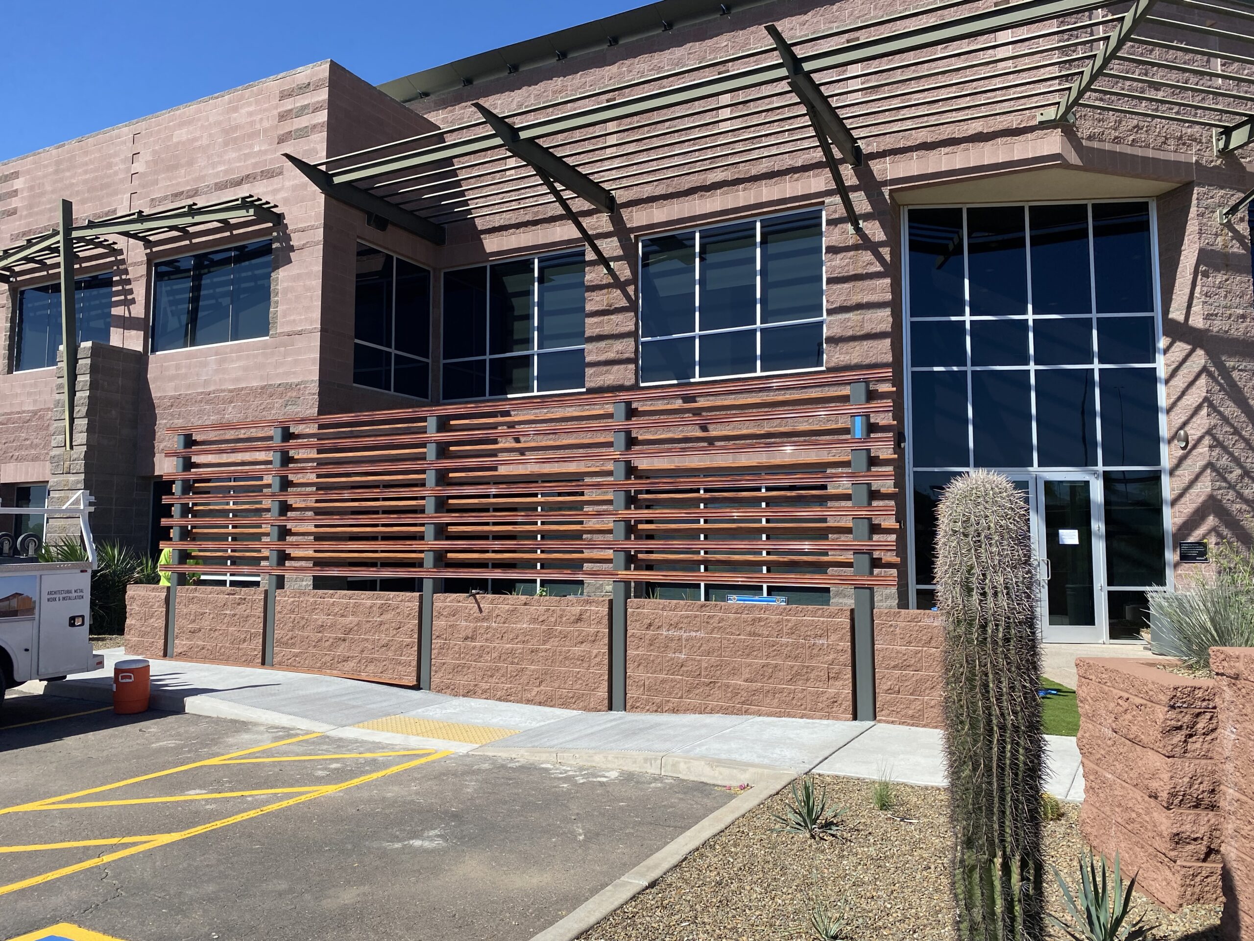 Two vertical privacy barriers at the Vitalant HQ in Scottsdale, Arizona, constructed from staggered Knotwood planks, providing visual separation and privacy for the outdoor spaces. Inside the building, we also fabricated and installed a stainless steel handrail and a glass guardrail system, adding modern elegance and safety to the interior.