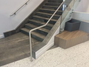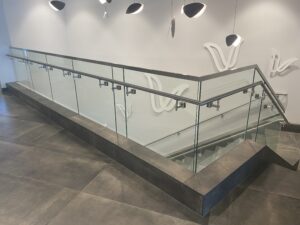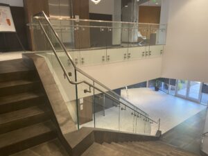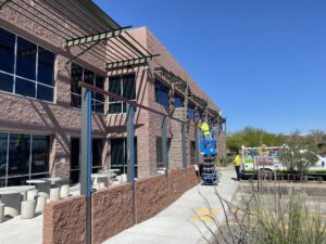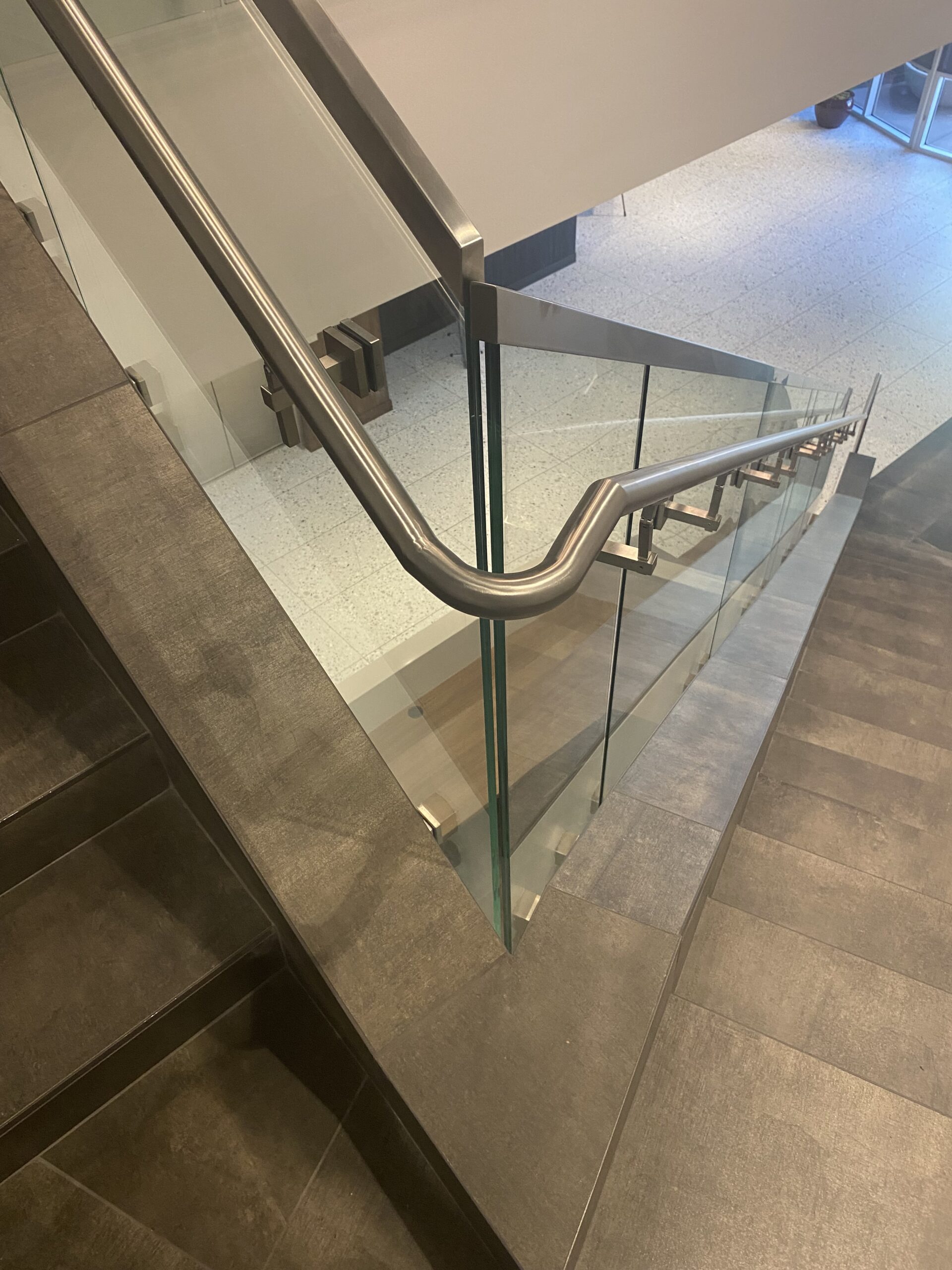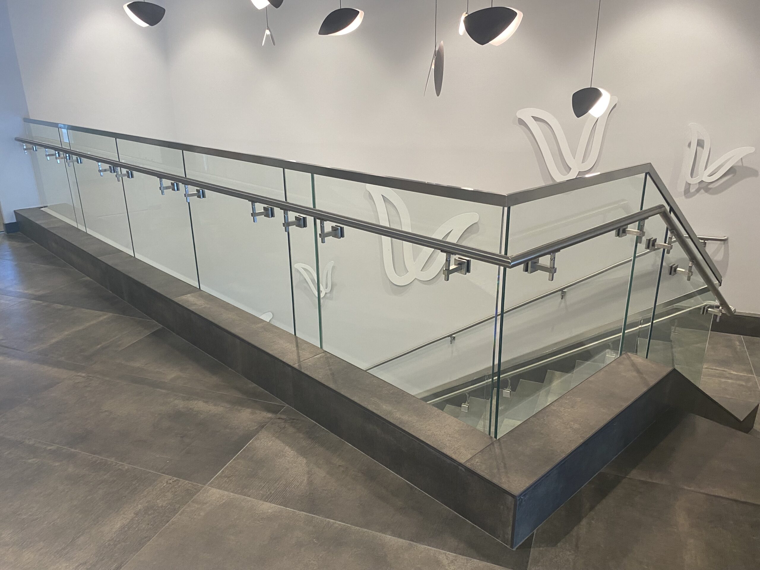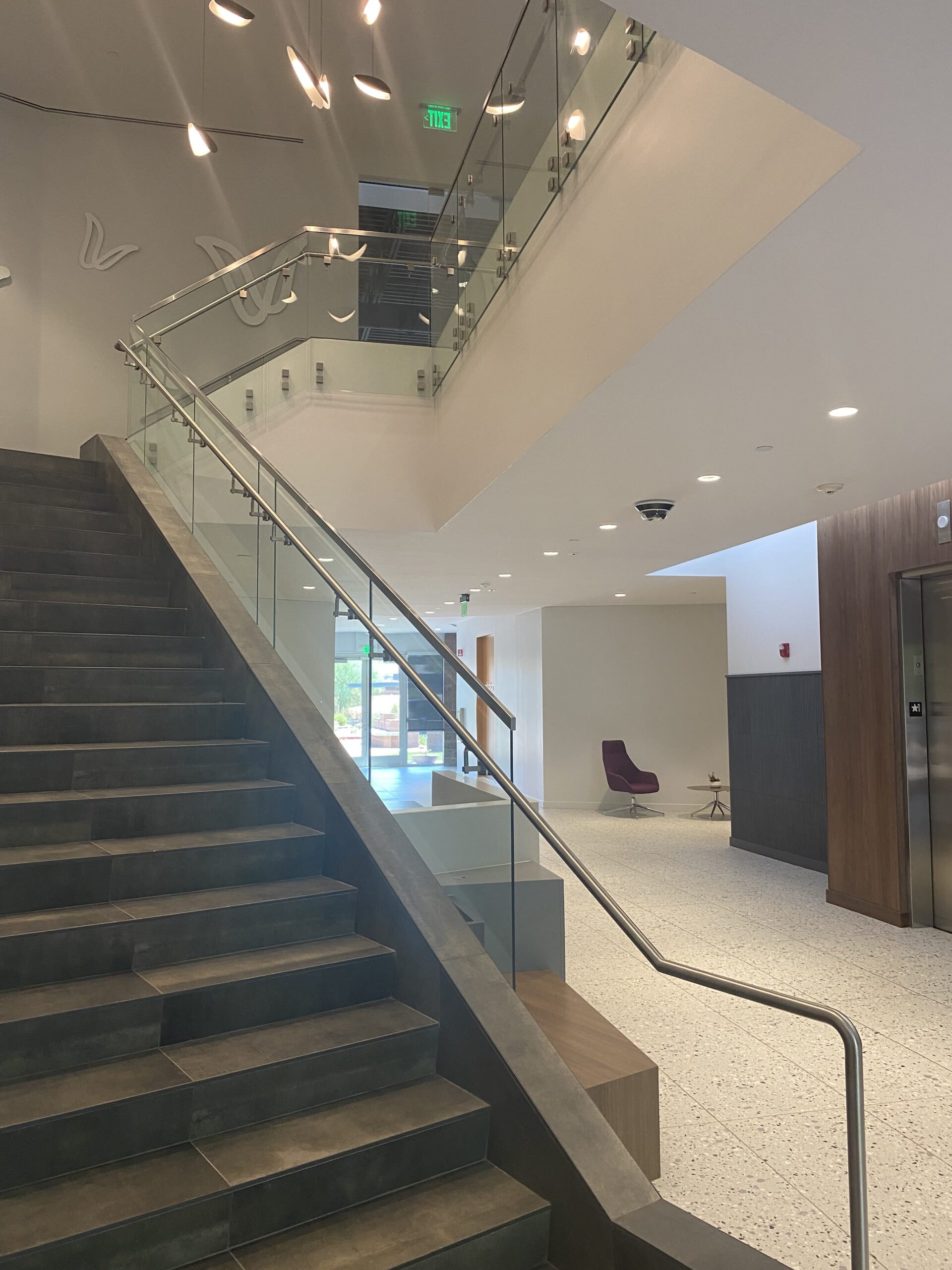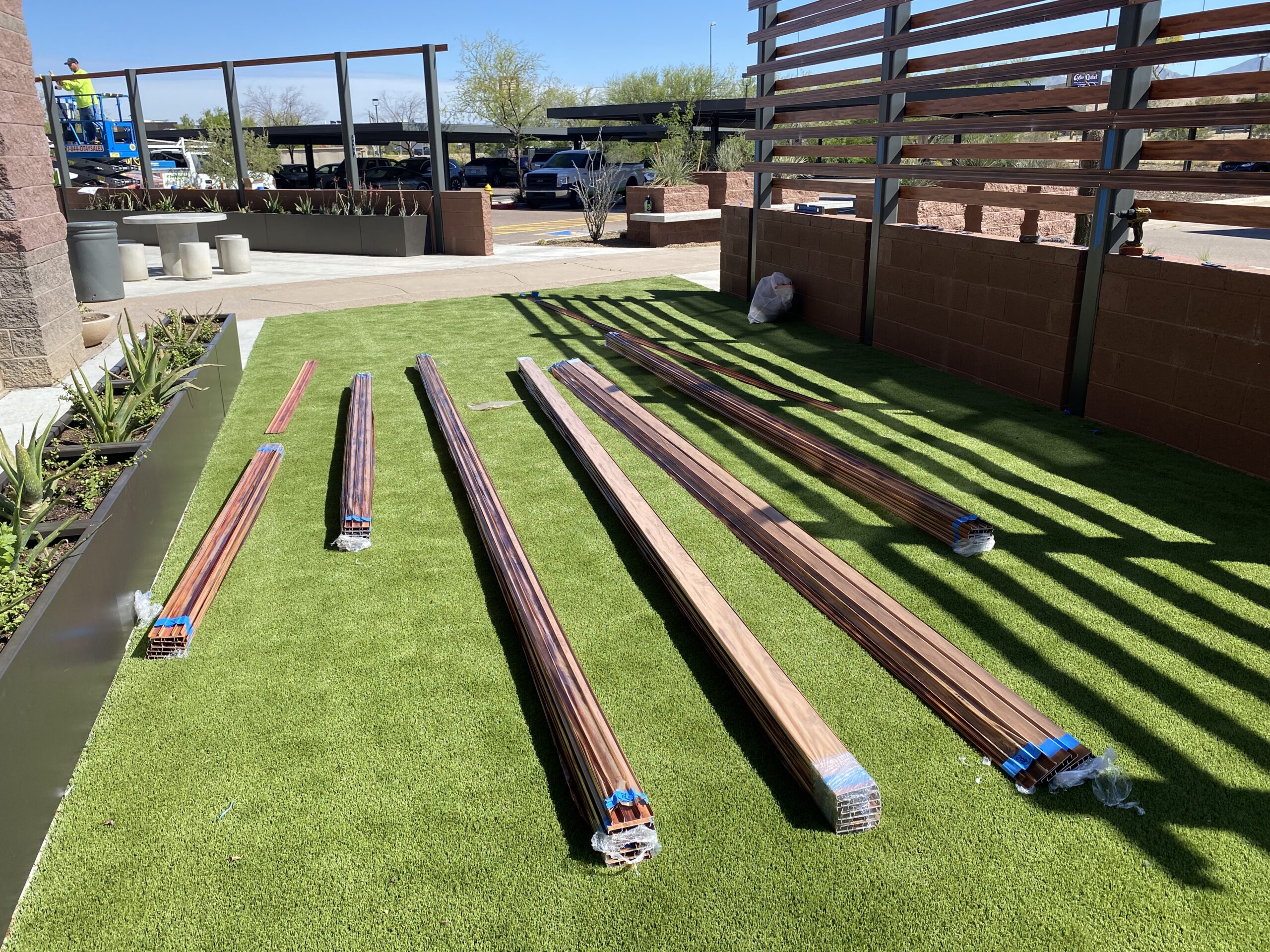 Two vertical privacy barriers at the Vitalant HQ in Scottsdale, Arizona, constructed from staggered Knotwood planks, providing visual separation and privacy for the outdoor spaces. Inside the building, we also fabricated and installed a stainless steel handrail and a glass guardrail system, adding modern elegance and safety to the interior.