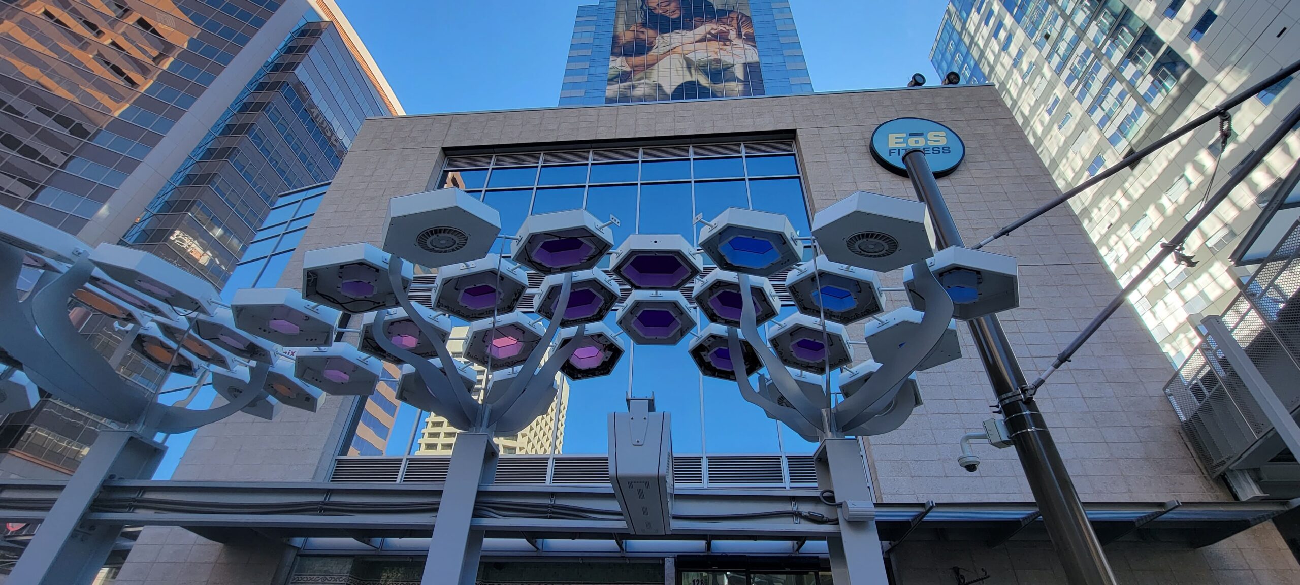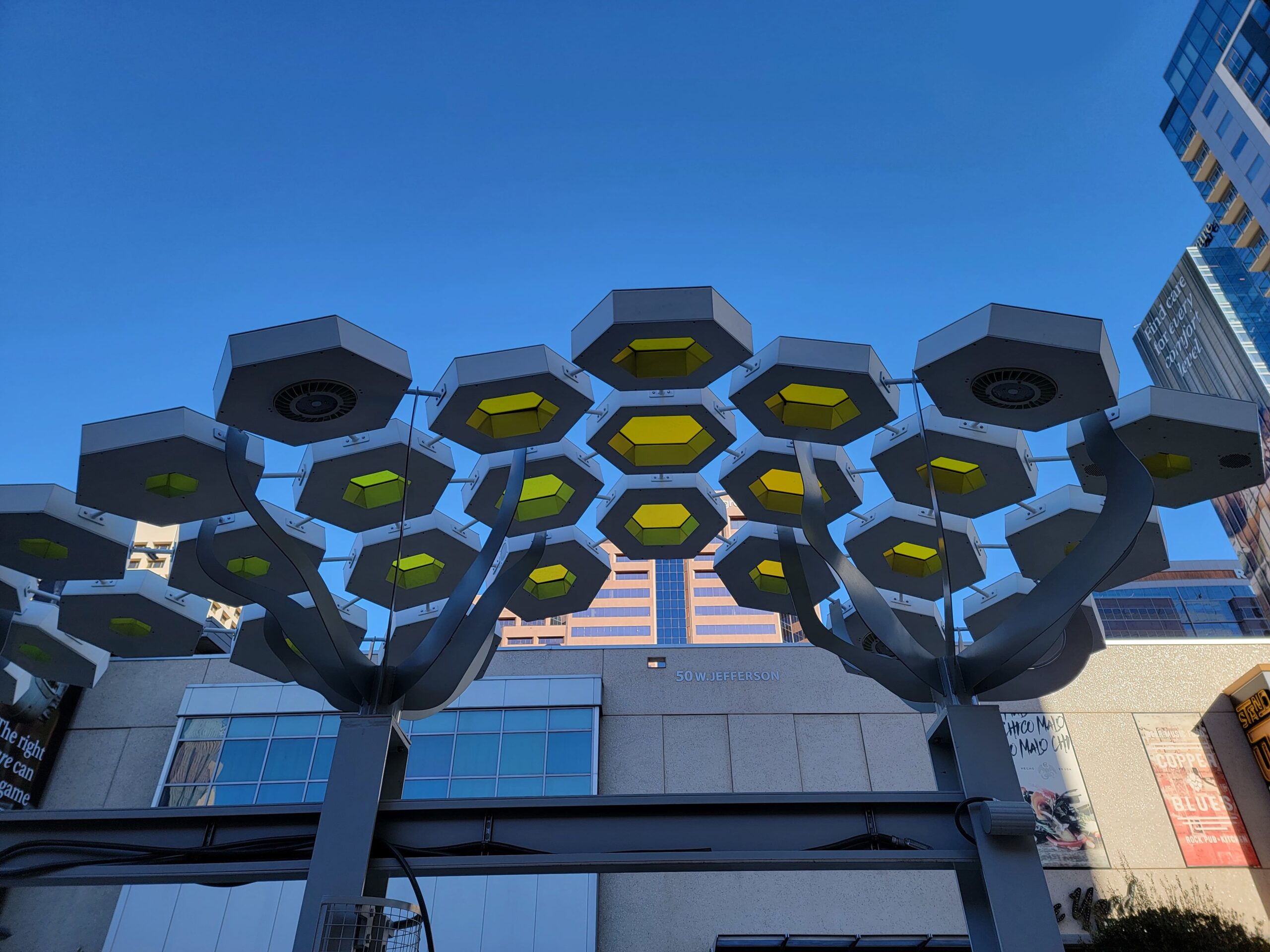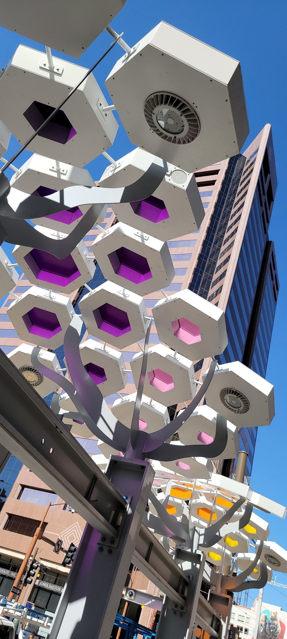 Decorative shade canopies line Central Avenue, featuring KodaXT polycarbonate skylights, custom-fabricated platforms, and integrated LED lighting that can be programmed to change color for special events and celebrations in Downtown Phoenix. The installation is comprised of more than 360 geometric pods spanning three Valley Metro Light Rail stations, creating a cohesive architectural element that provides shade, enhances the pedestrian experience, and adds a dynamic visual presence to the urban corridor.