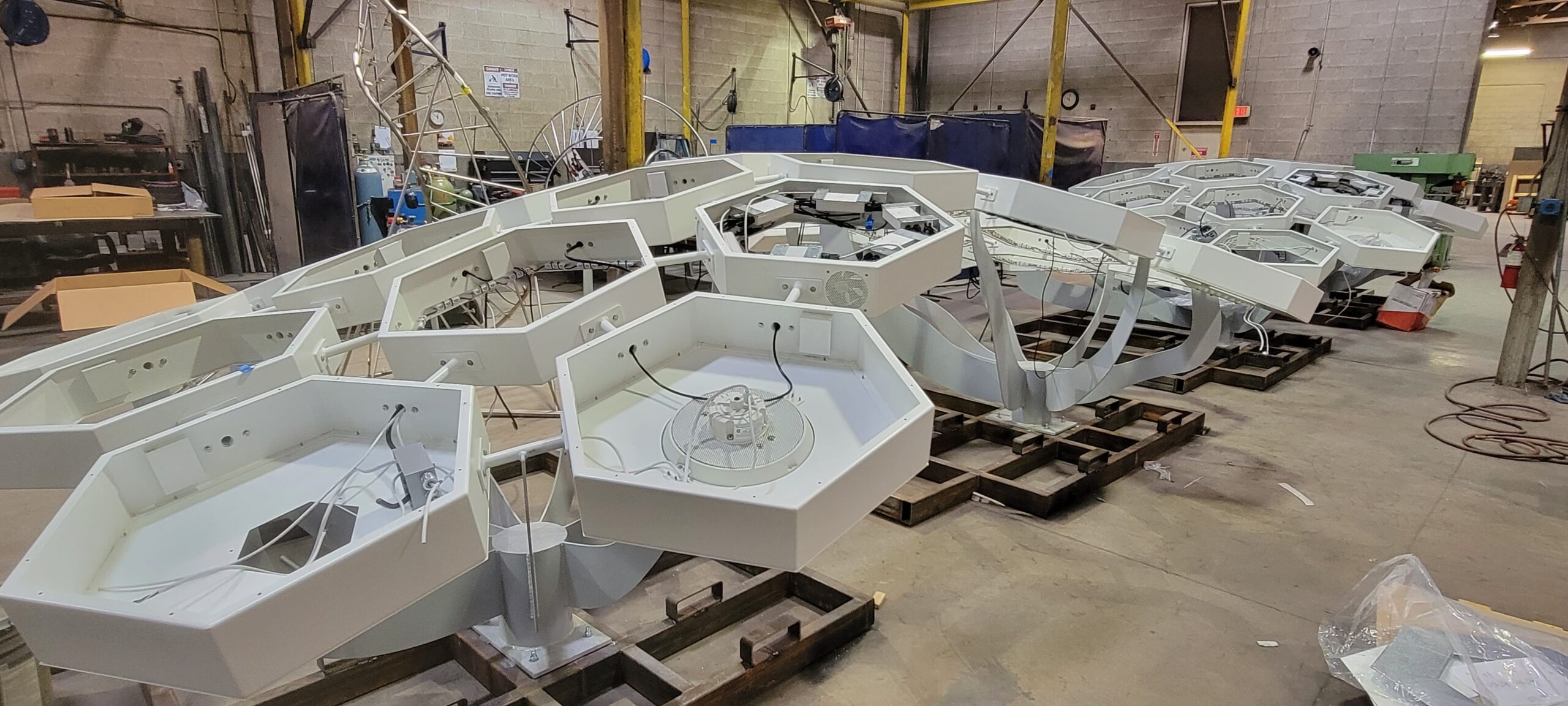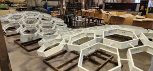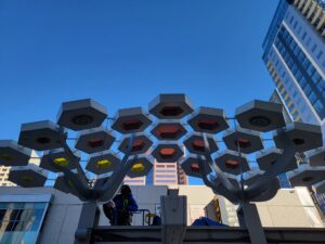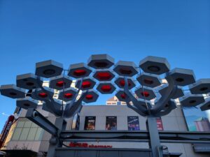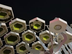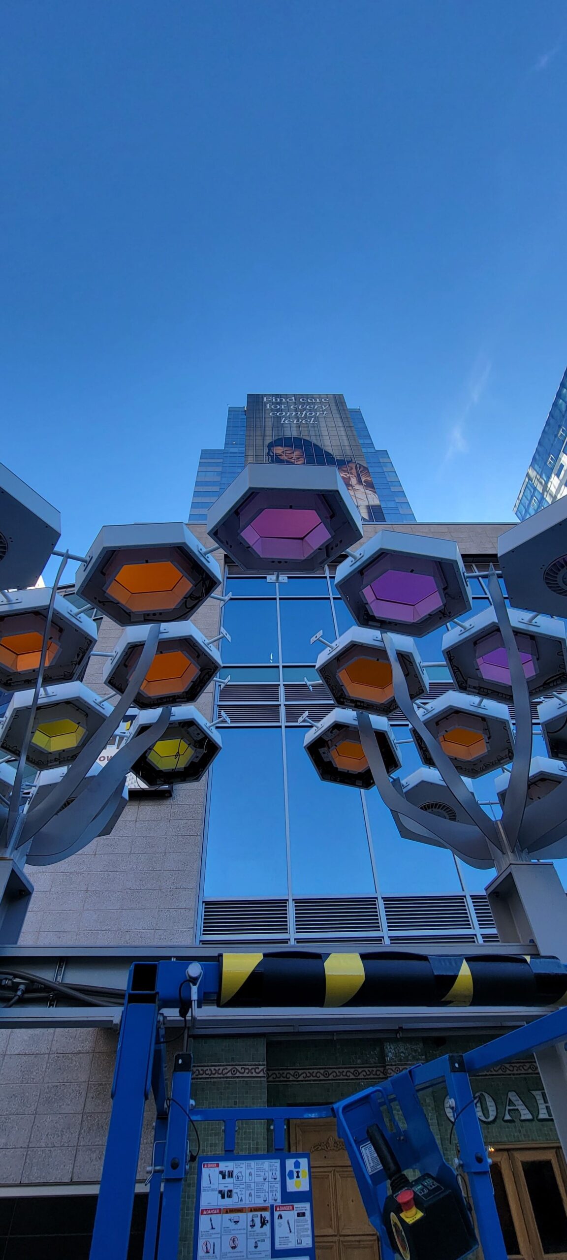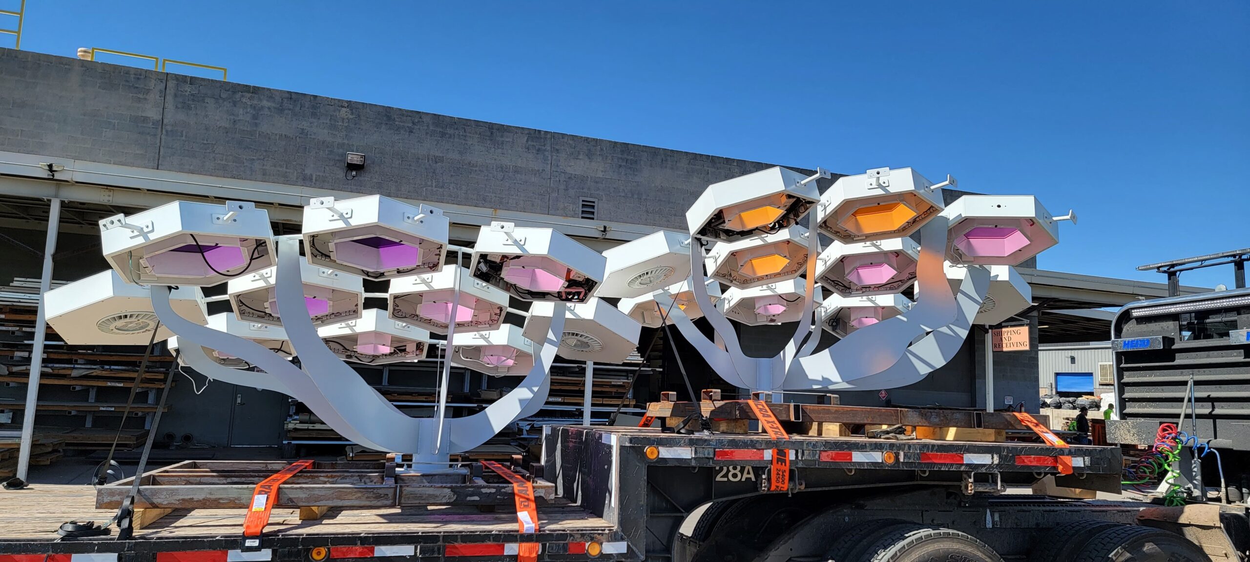 Decorative shade canopies line Central Avenue, featuring KodaXT polycarbonate skylights, custom-fabricated platforms, and integrated LED lighting that can be programmed to change color for special events and celebrations in Downtown Phoenix. The installation is comprised of more than 360 geometric pods spanning three Valley Metro Light Rail stations, creating a cohesive architectural element that provides shade, enhances the pedestrian experience, and adds a dynamic visual presence to the urban corridor.